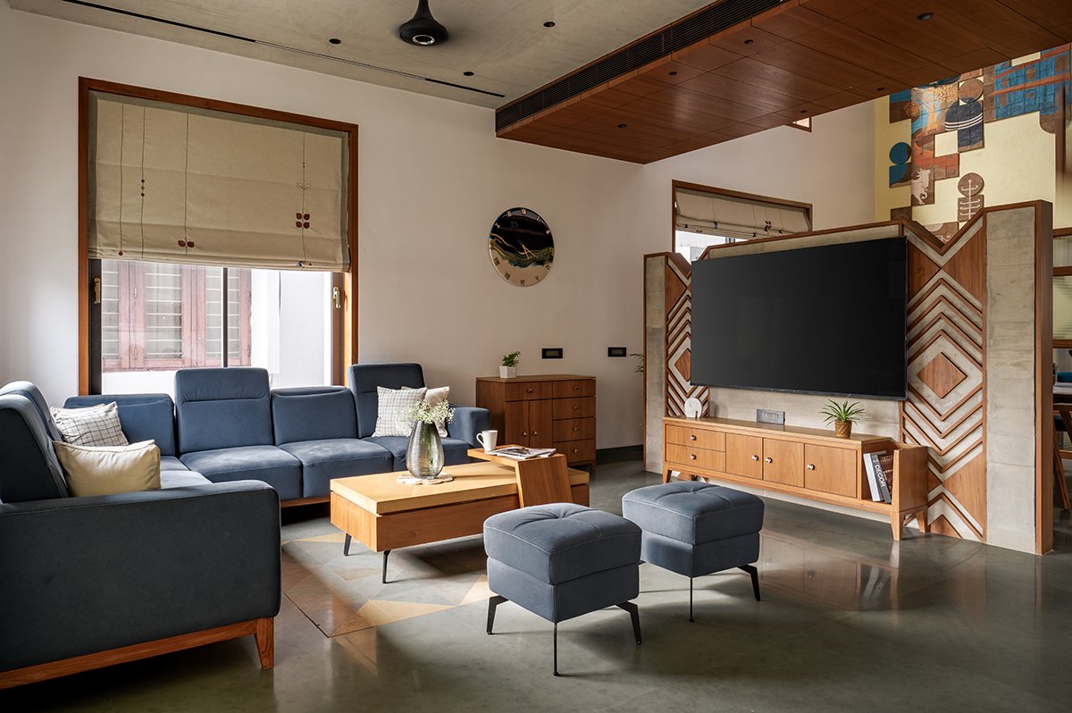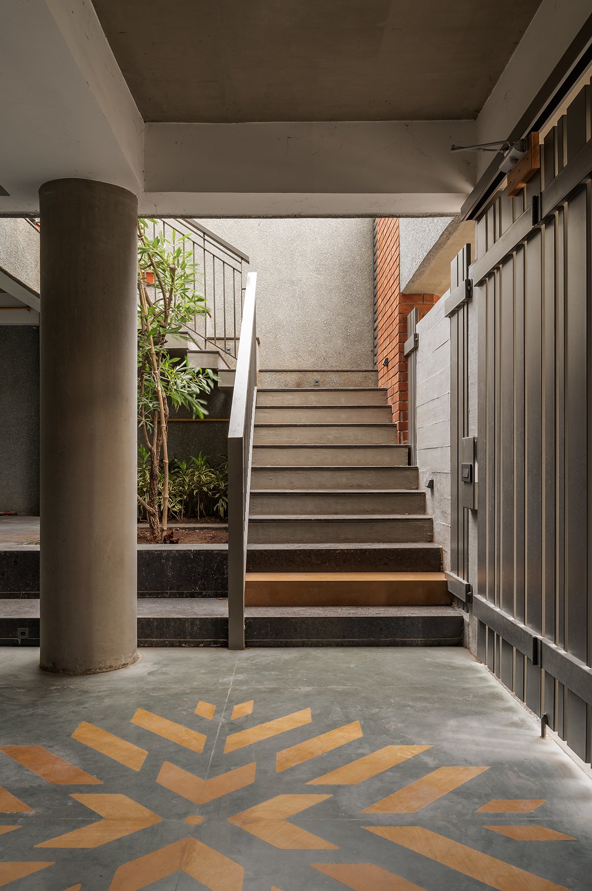 The interiors are a play of a very few colors; mostly grey Kota floor with yellow sandstone highlighters, softness of wooden furnishing and a play of exposed RCC & exposed brickwork as a pinch of salt in all of it. A composition made up of intricate geometrical patterns in different furniture pieces and flooring that reflects earthen interior language.