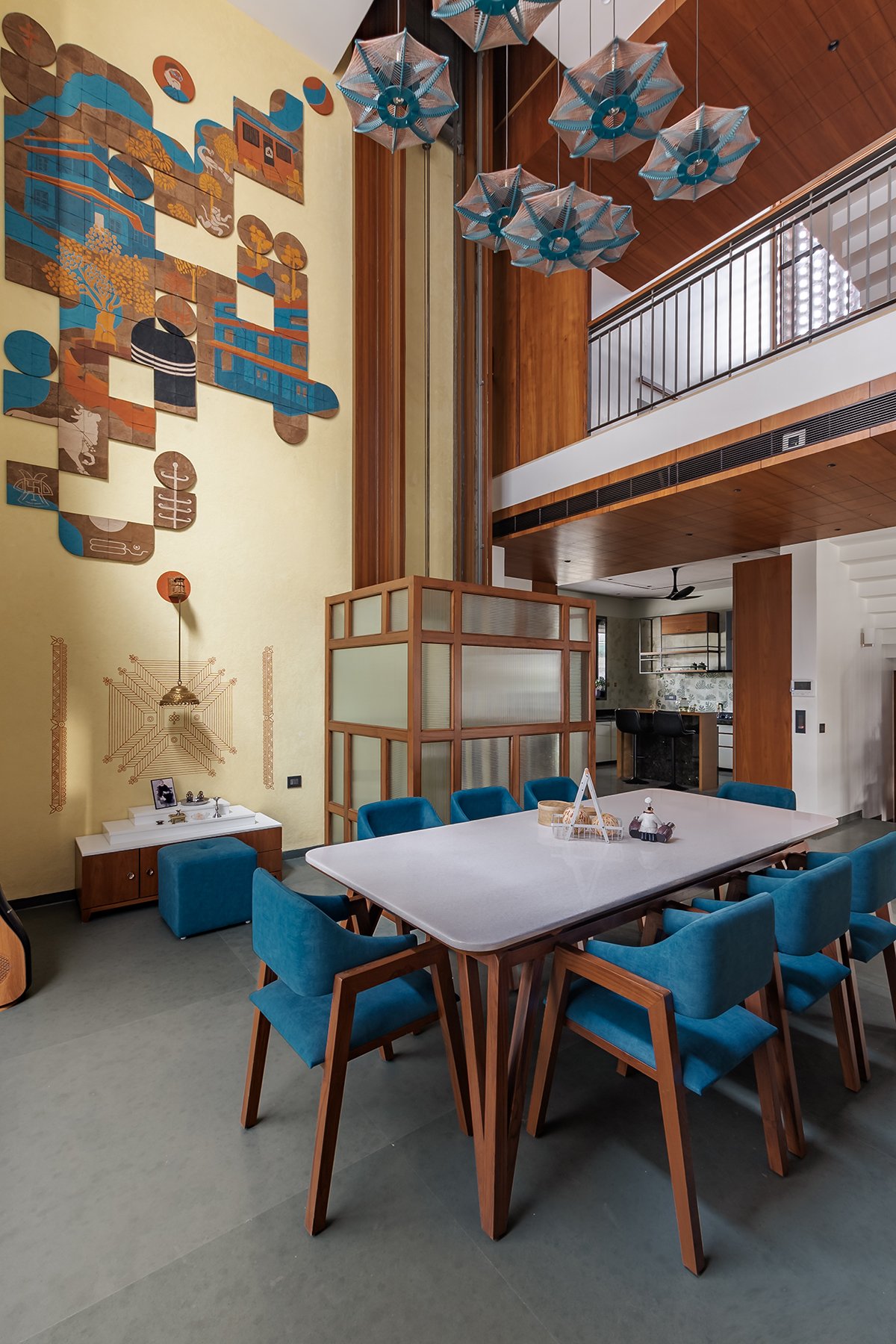 The double height volume of dining and staircase is divided by a bridge connecting the master bedroom to daughters’ bedroom on the 2nd floor.