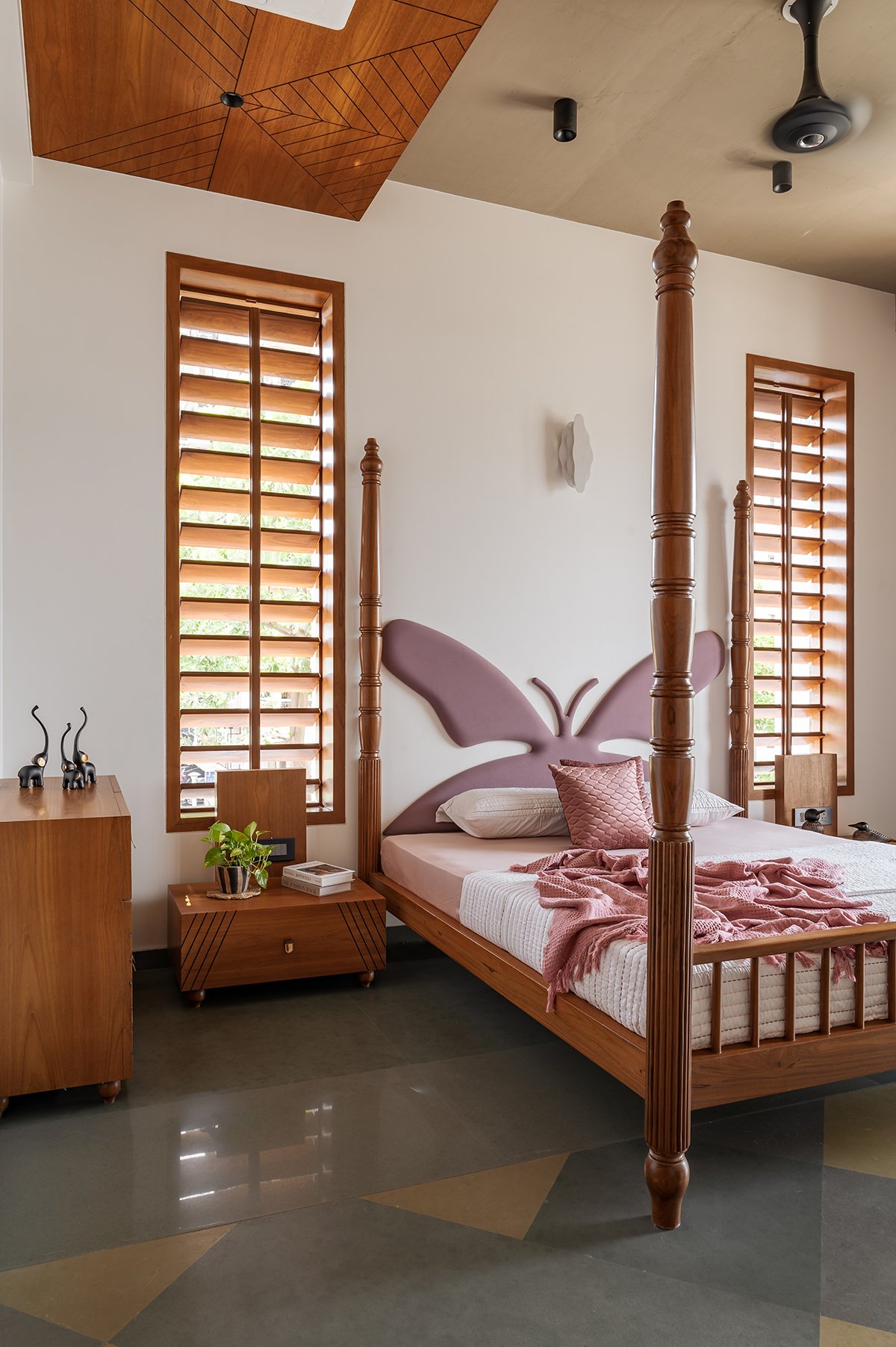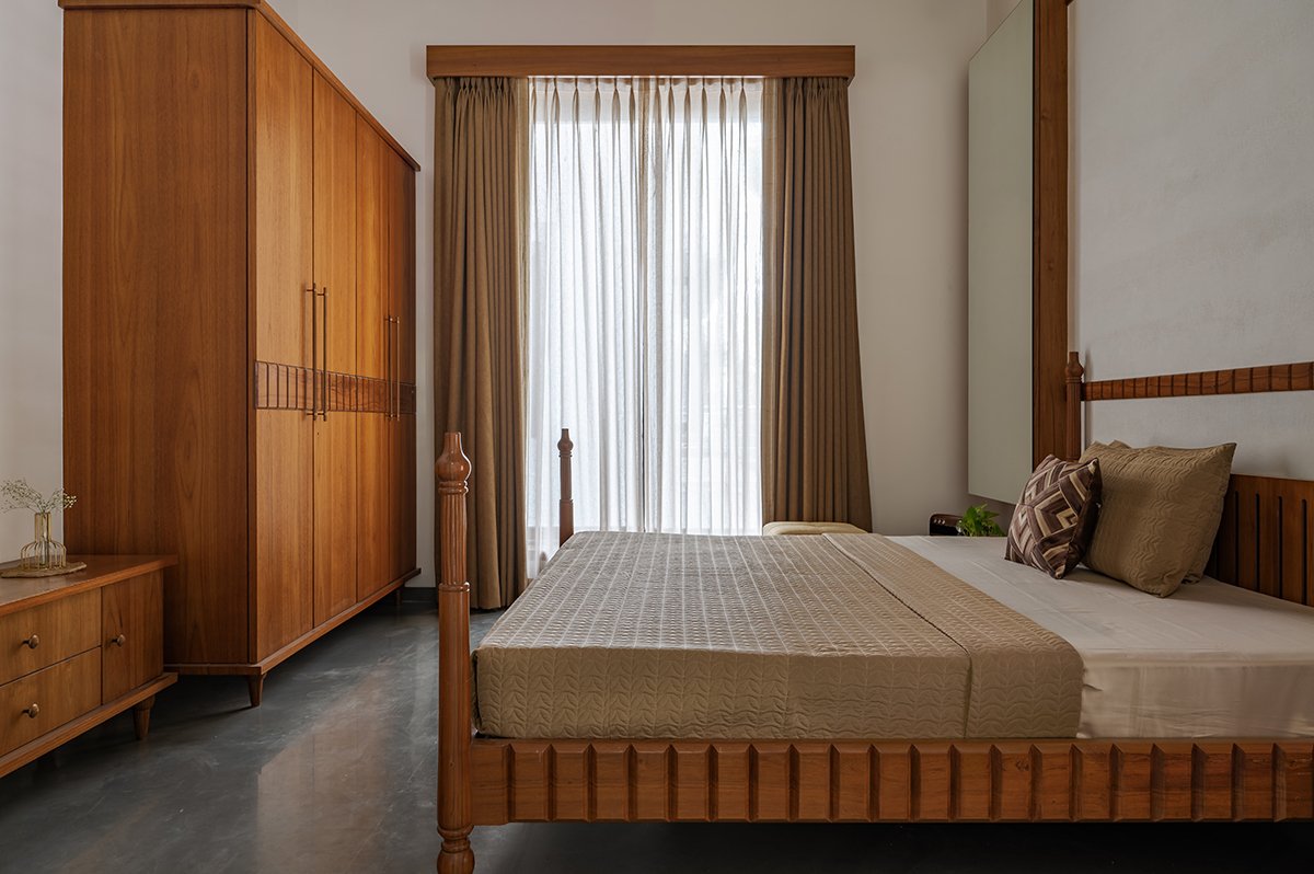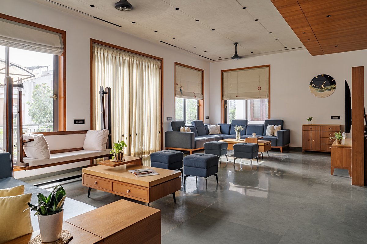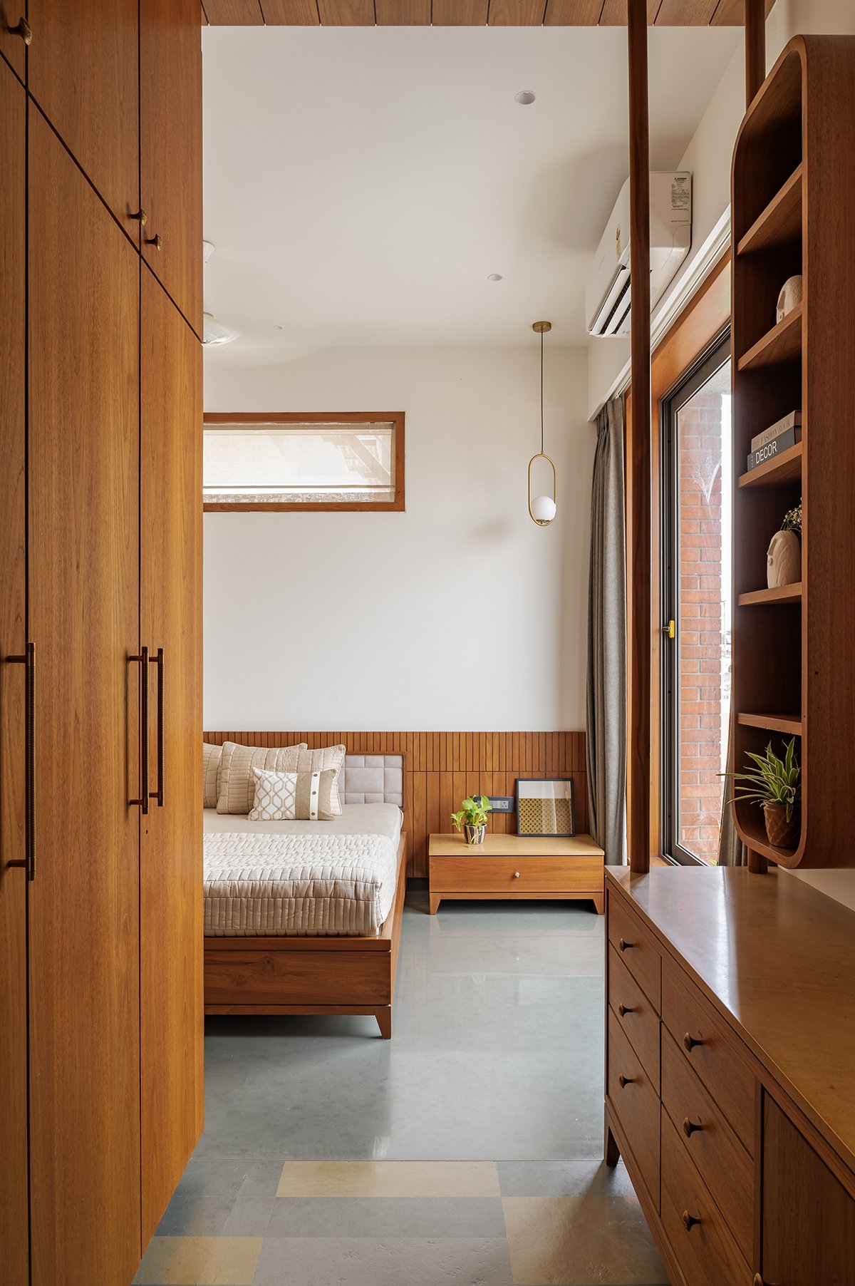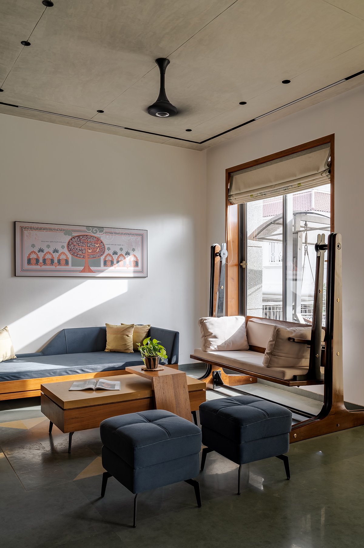 “One should be able to absorb ample amounts of natural light and air” said the client, thus the intervention of almost full heighted windows with wooden frames was created. To block the harsh sun of south, as a passive cooling element, the intricate terracotta brick jali was designed in herring bone pattern, which added the layer of intimacy of natural light into interiors.