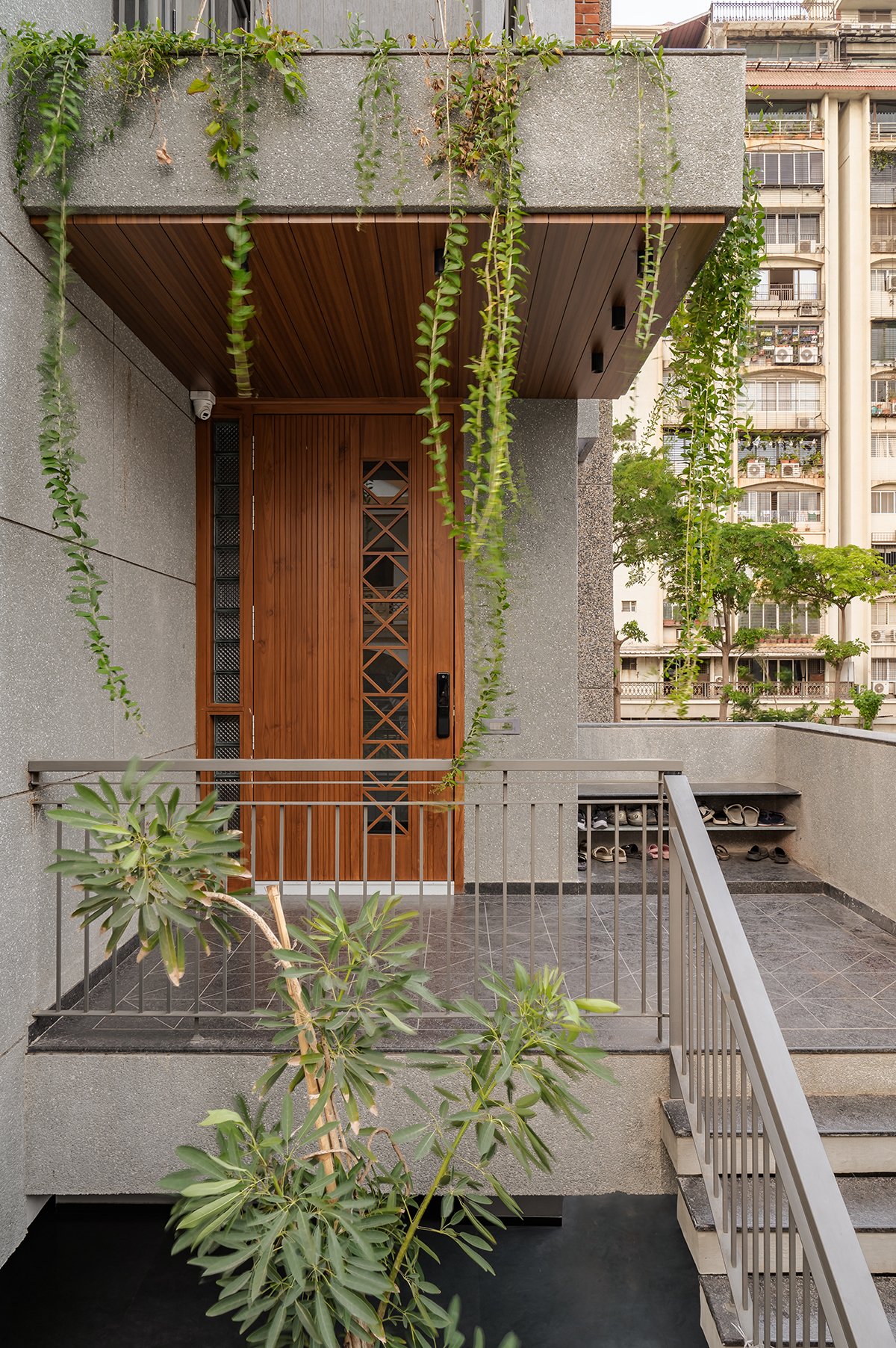 “The home should be reflecting the persona of people residing in”; is the driving force while composing material palette. The entrance stairway is imagined as a journey from lush green landscape to the humble abode. The dark granite flooring acts as a backdrop that highlights surrounding greenery. Yellow Jaisalmer sandstone is used as a path finder in this play of grey and green. The very space of entrance, geometrical pattern in flooring and the first step, called “yellow step” of Jaisalmer sandstone, are mindful ways of leading one further onto the path.