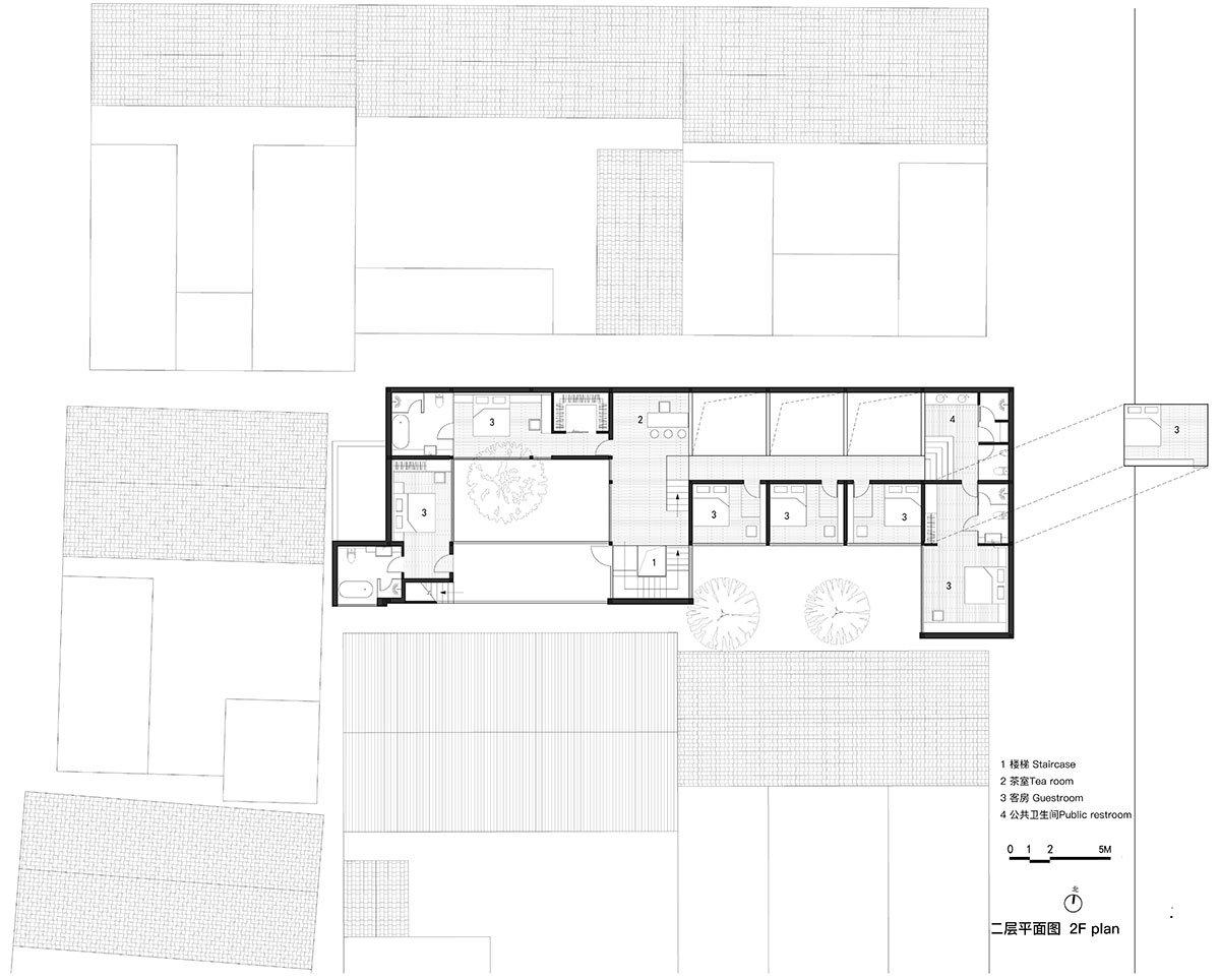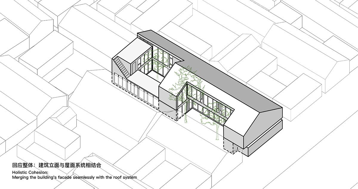 The project needed to cater to both group retreats and individual guests by incorporating Chinese and Western-style kitchens, a dining room, a living room, a recreation room, and a chess and card room for the elderly. To meet these requirements, the new building had to be roughly double the footprint of the original structures.
