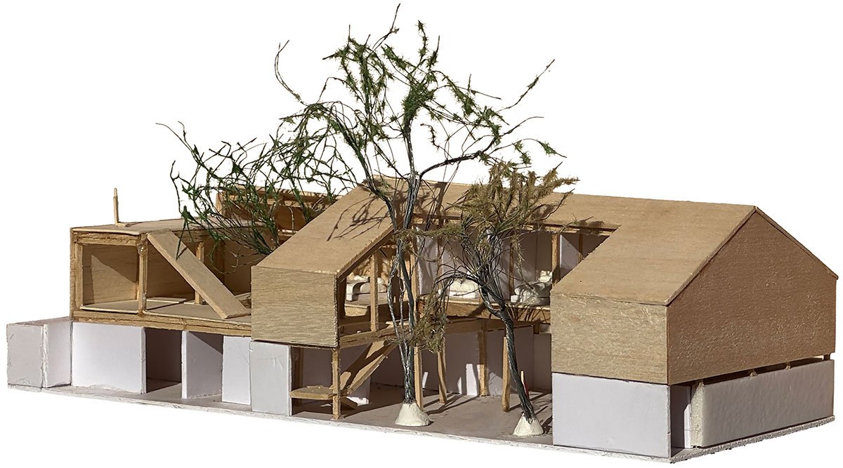 Conceptualization and Formation: The three trees within the site inspired the architectural design, and also the project name, “Lei Homestay.” The term “Lei”(耒) originates from an ancient agricultural tool, representing rural agrarian life. Its written form is composed of three “wood” (木) strokes, evoking the image of trees and informing the architectural concept of an interwoven wooden framework.