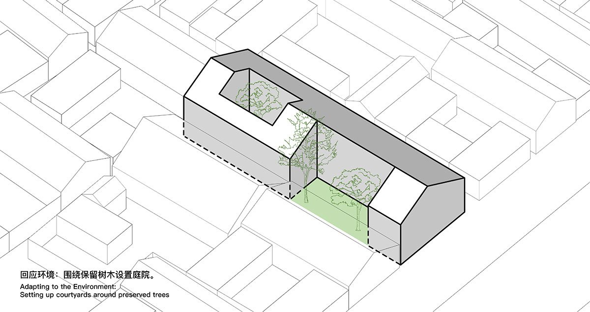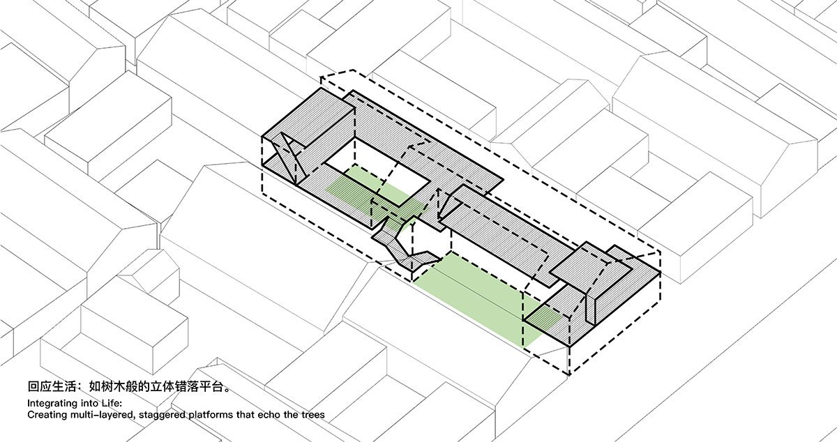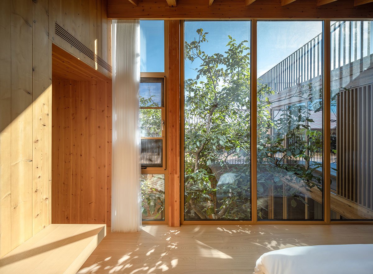 The building is organized around the trees, forming two well-proportioned courtyards that bring in ample sunlight and views of seasonal changes. This layout continues the traditional courtyard house typology of the village. The main structure is crafted from glued laminated timber, which, beneath the double-pitched roof, supports a variety of staggered platform spaces, evoking the sensation of living amidst a forest.