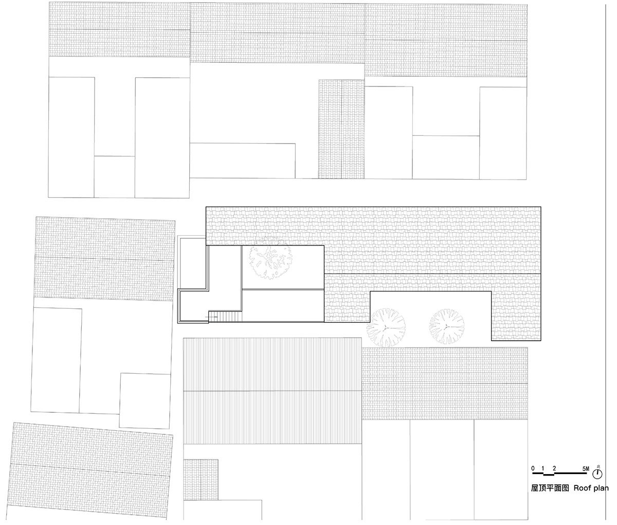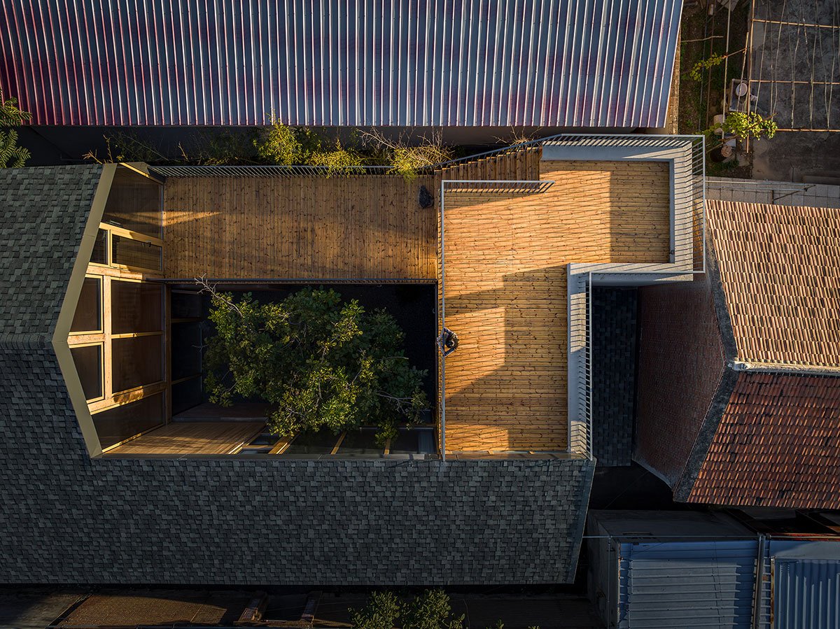 The site lies adjacent to the village’s main road on its eastern side, spanning approximately 400 square meters. It is a rectangular plot, longer from east to west and shorter from north to south. The original buildings on the site were rather disorganized, comprising both pitched-roof and flat-roof brick-concrete structures, along with some temporary buildings constructed with colored steel roofs, none of which held preservation value. Within the plot stand two persimmon trees and one walnut tree, planted by the homeowner’s father during his childhood. Still flourishing and fruitful, these trees have become treasured family memories. After discussions between the designers and the homeowner, all three trees were preserved.