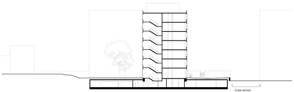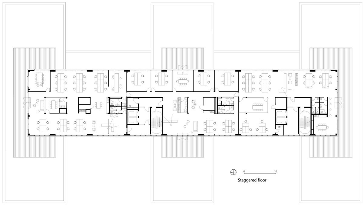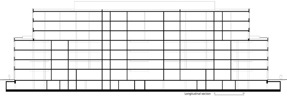 Green courtyards open up between the detached parts of the building. All roofs are planned as extensive green roofs. In the area of the staggered storeys, there are also roof terraces as elevated constructions, which, however, are not accessible without steps in relation to the utilization unit. In total, the two buildings have a gross floor area of approx. 50,000 m2.