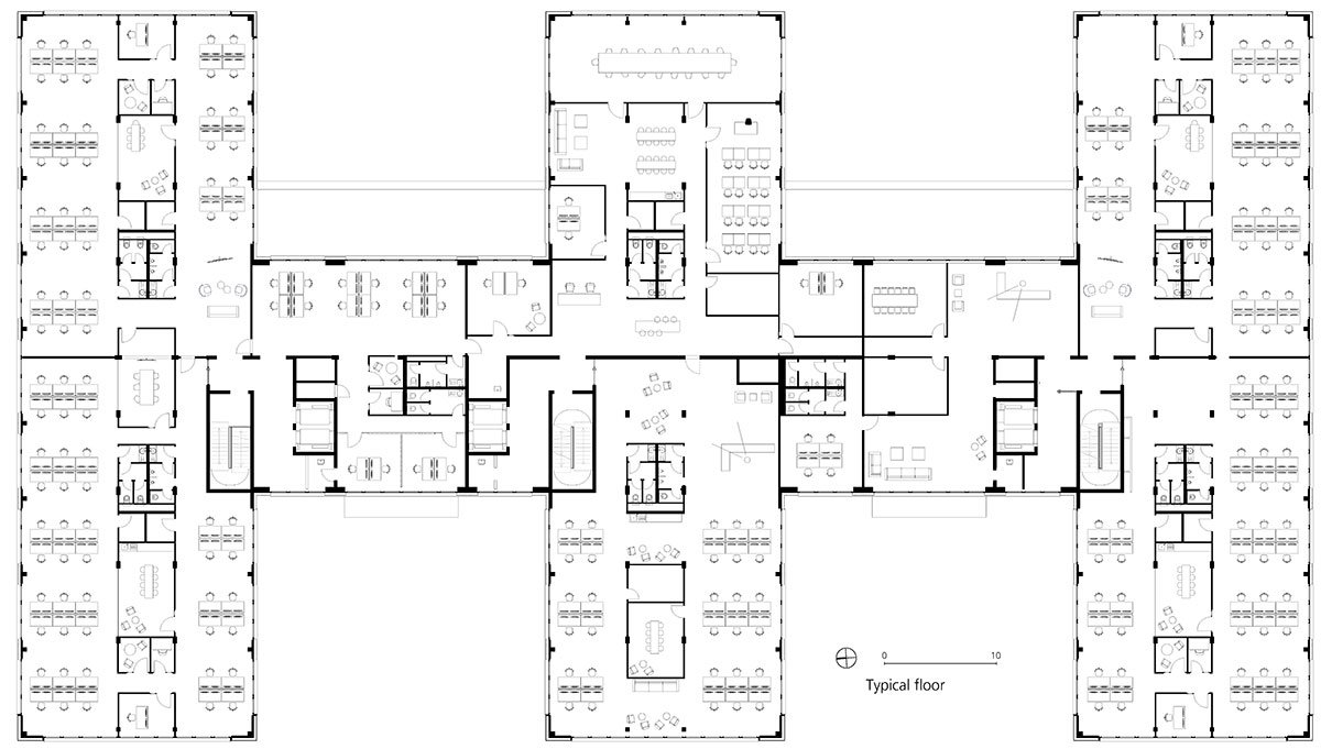 The volume of the building “LEO” consists of three transverse, three-storey crossbars, which are connected longitudinally by a seven-storey building section. Three independent staircases connect the different levels and can be reached from the main entrance areas on the ground floor. Attached to each stairwell is a lift system with two lifts. The rental areas are designed to be flexible, allowing both a cellular office layout and an open-space variety. The “ALEX” building consists of a seven-storey block, from which three cross-blocks of the same height lead off to the west.