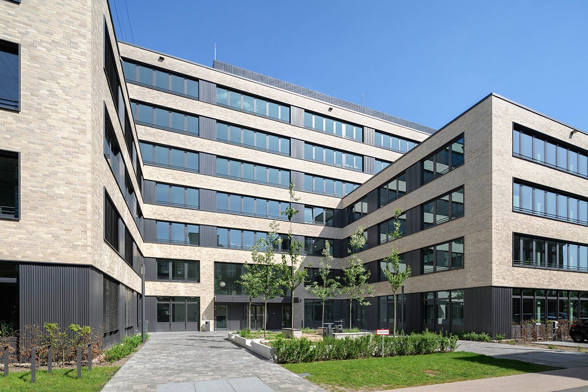 The exterior façade of building “LEO” is structured by a grey-beige mottled brick façade. The columns between the window bands were planned as a relief sheet metal cladding. On the ground floor, closed parapet elements were installed as privacy screens in front of the floor-to-ceiling window elements, as well as external sun protection.