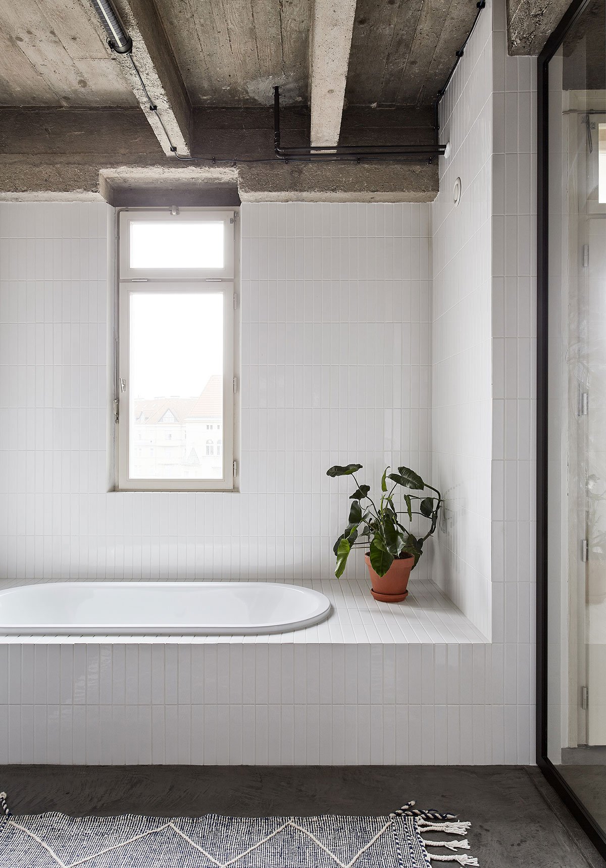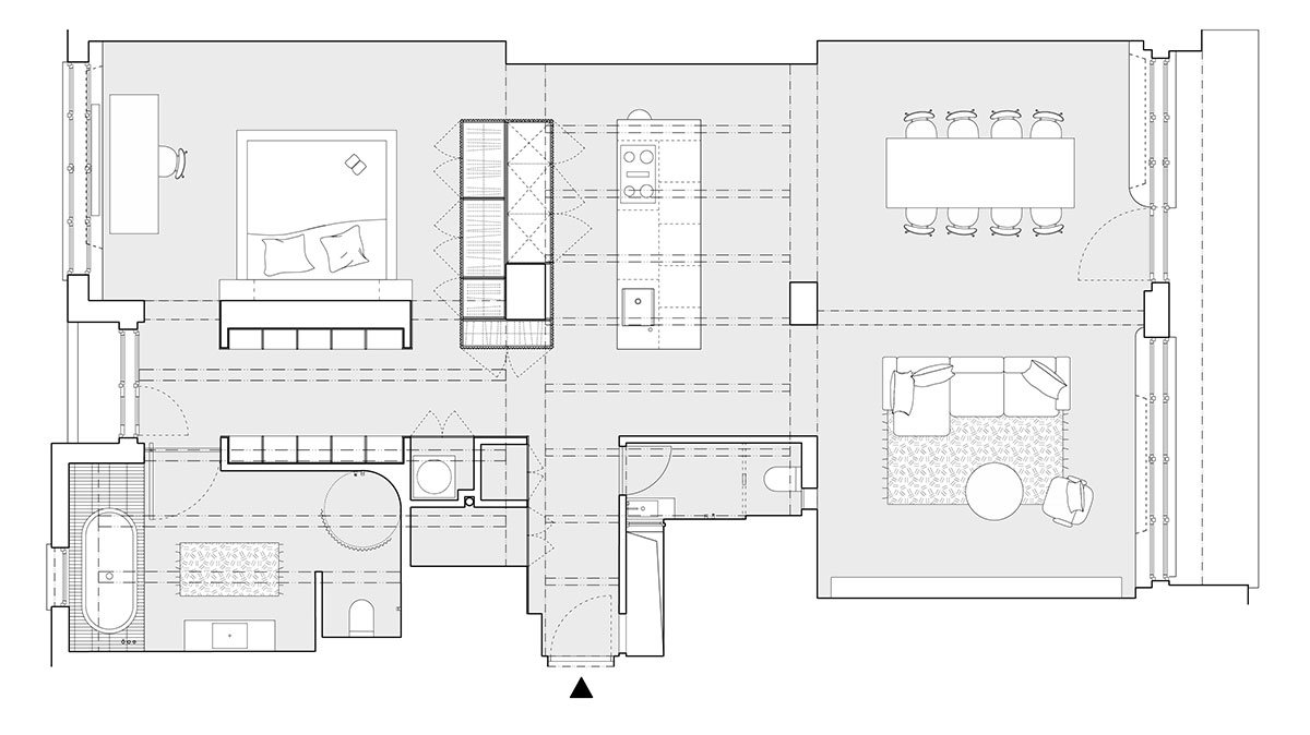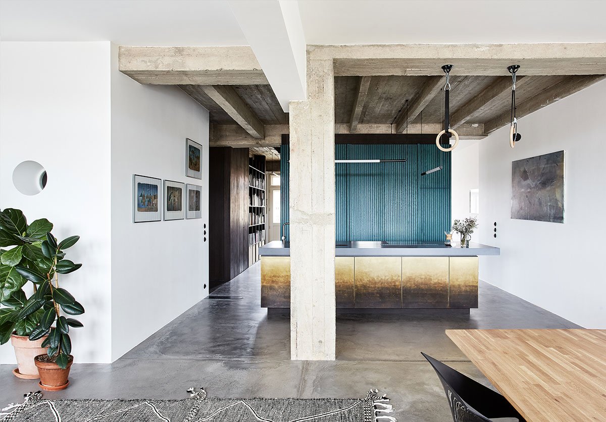 [Text as submitted by architect] How do you create one open space out of a large multi-room apartment so that there doesn’t have to be a door between rooms the client wanted as few as possible, but you still felt like the rooms were separated? We tried to clean the whole space, to use the existing structural and technical parameters of the apartment. The reinforced concrete ceiling structure with ribs was also exposed. This gave the apartment a rawer character.