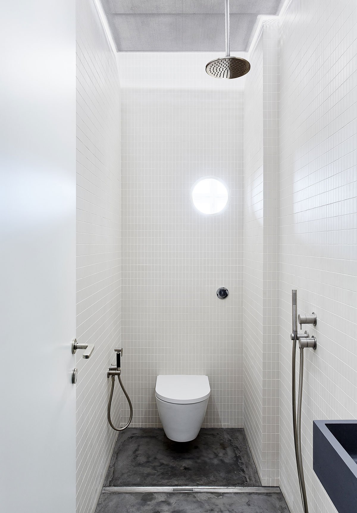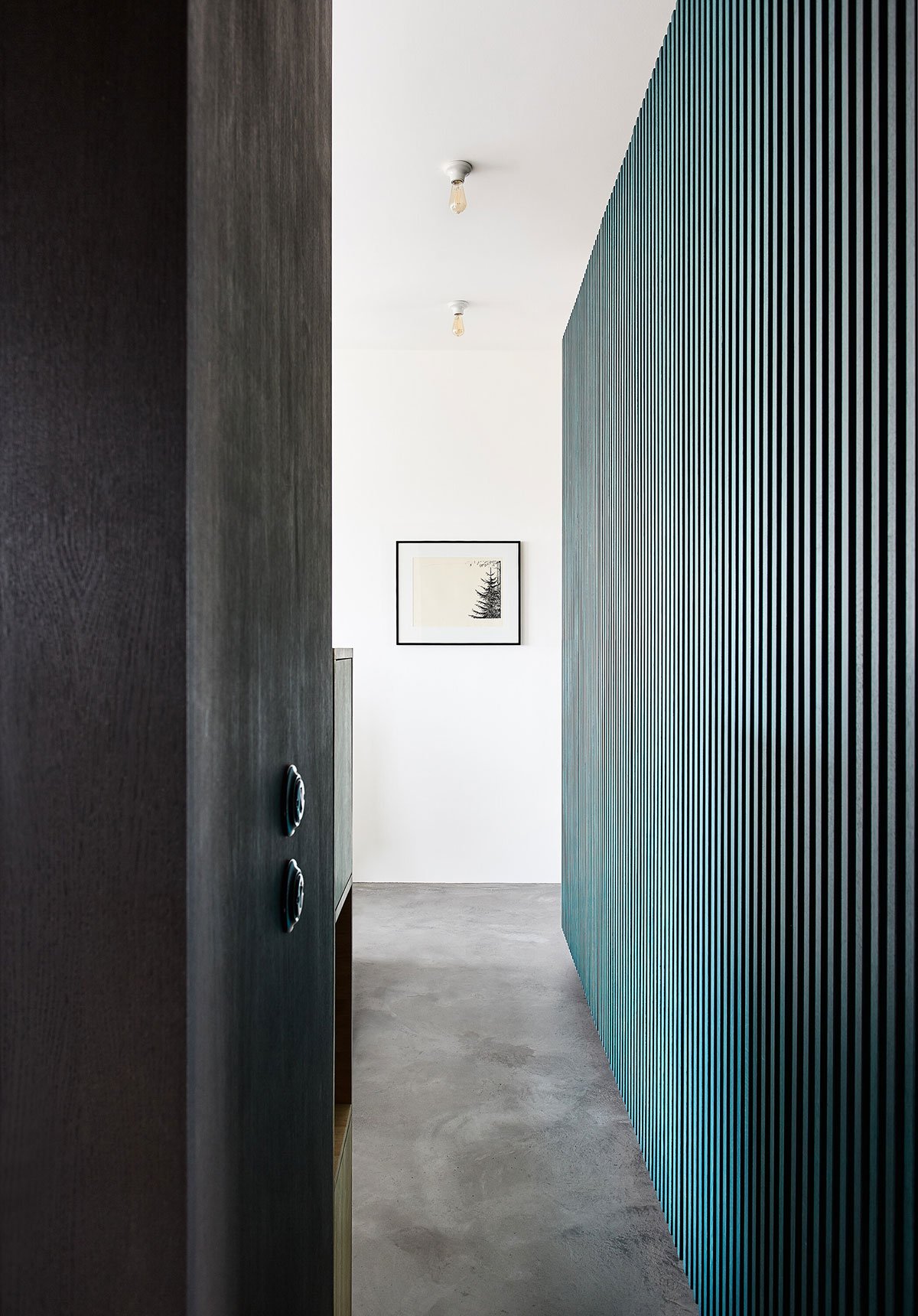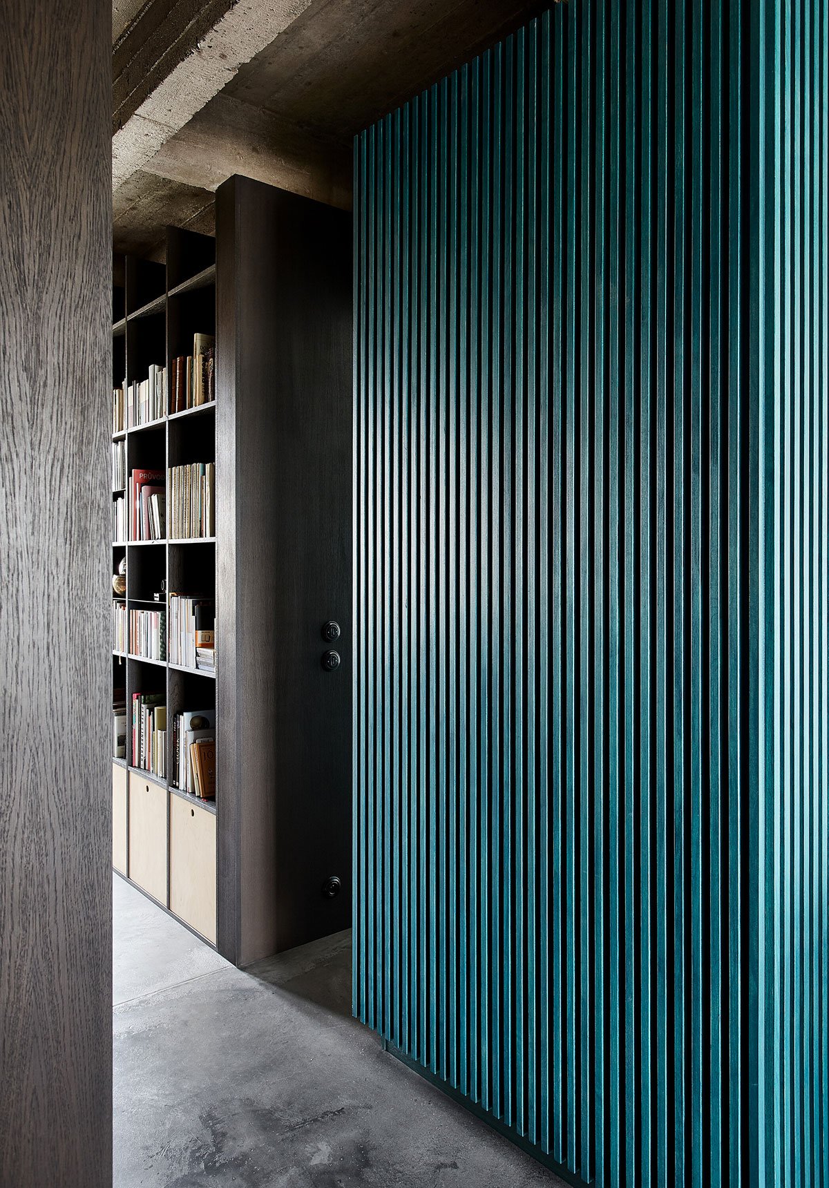 At the entrance, there is a small utility room and two built-in wardrobes. One is recessed in a dark paneling that goes around the corner into a library. The other is located in a green box. The central space is the kitchen with an island lined with patinated brass panels. This has a solid concrete countertop. The island’s countertop surface has cleverly hidden openings for things like bio-waste sorters. The bedroom is located behind the green box. It has three entrances. The headboard uses the existing massive chimney as a divider. There is a pass-through library between the master bathroom and the bedroom.