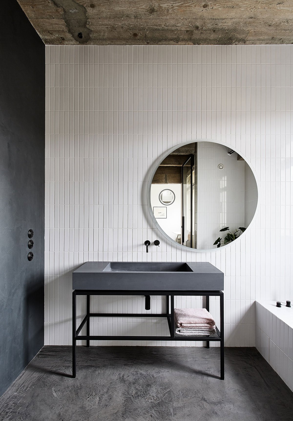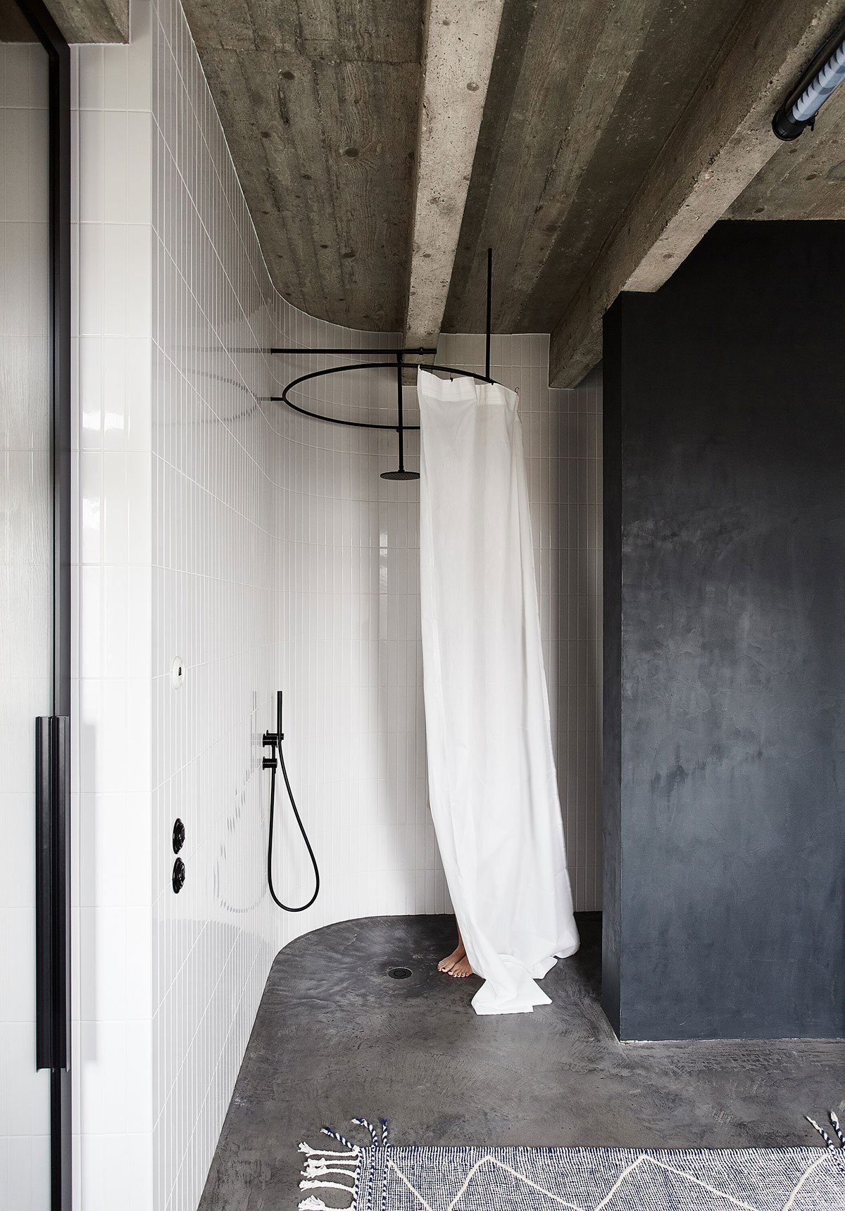 The supporting theme of the concept was the choice of flooring, which was supposed to be uniform throughout the apartment, including in the bathrooms and shower spaces. One of the options was a terrazzo floor but after a static analysis, the client and I decided on a brushed concrete screed.