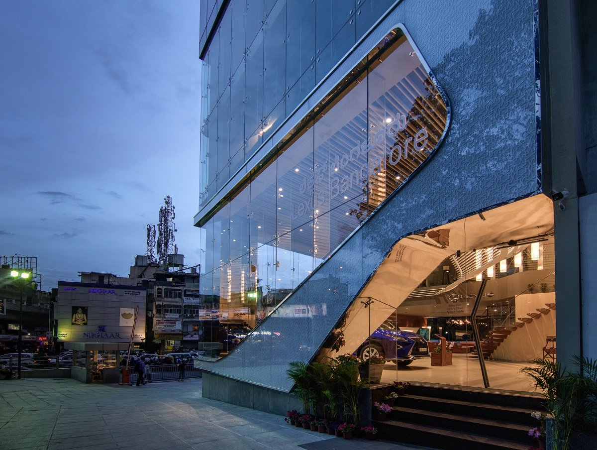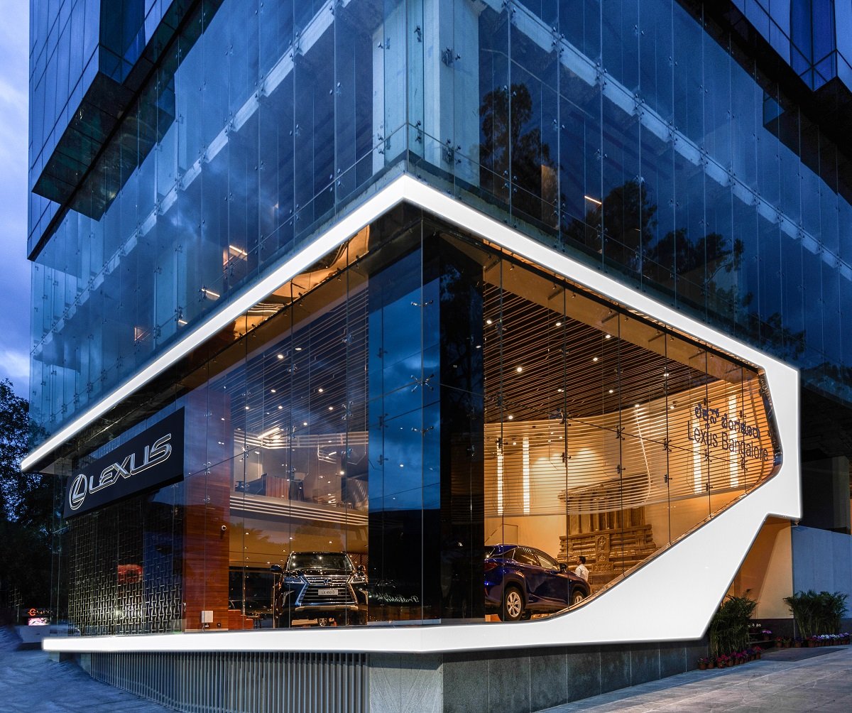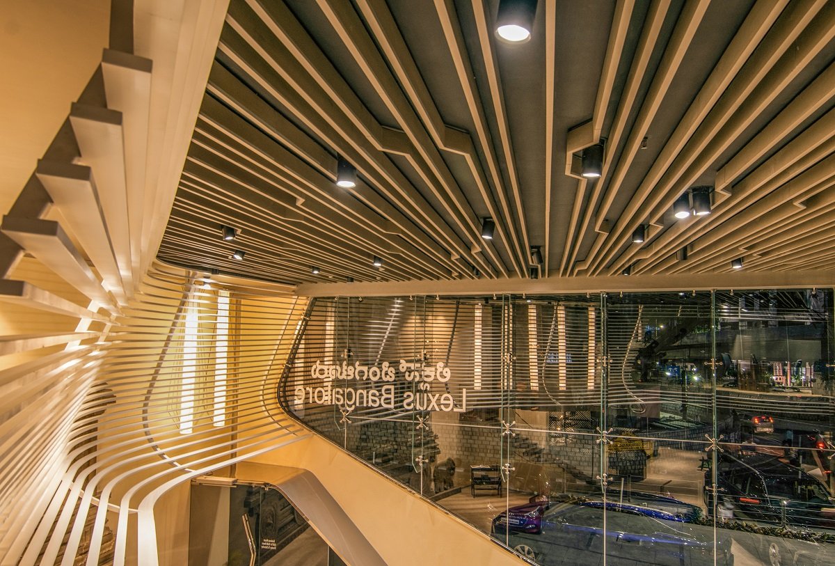 The site is located at Richmond circle, Bengaluru, a part commercial and residential area with dense traffic influx. The idea for the external facade was derived from the iconic grill designs of the Lexus cars that resemble a spindle. The bold frame plays out in the external facade and continues inside as an L-shaped trellis and engulfs the showroom as the main interior feature. The frame not only creates an interesting visual dialogue but also hides services and frees the display area volume.