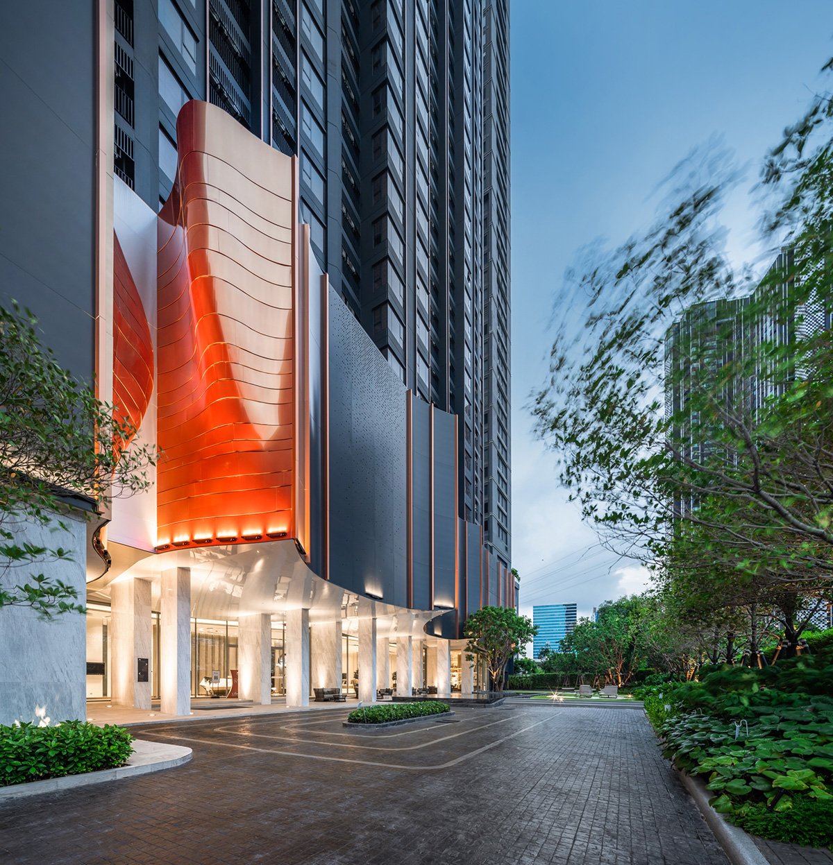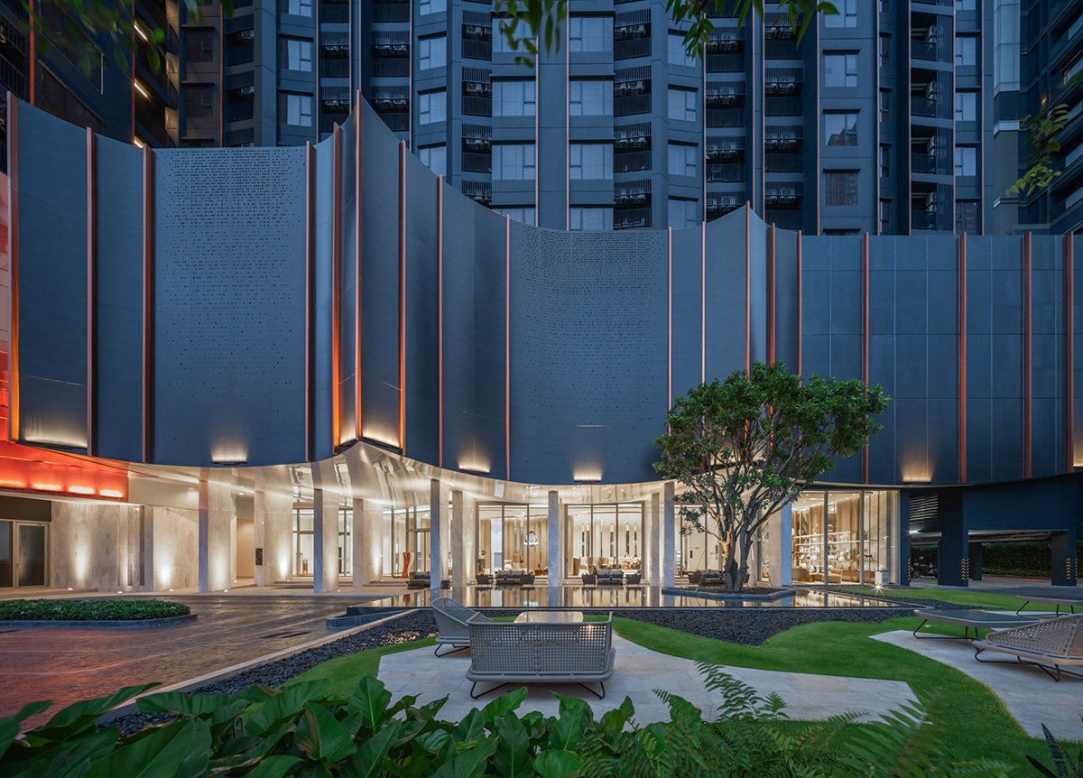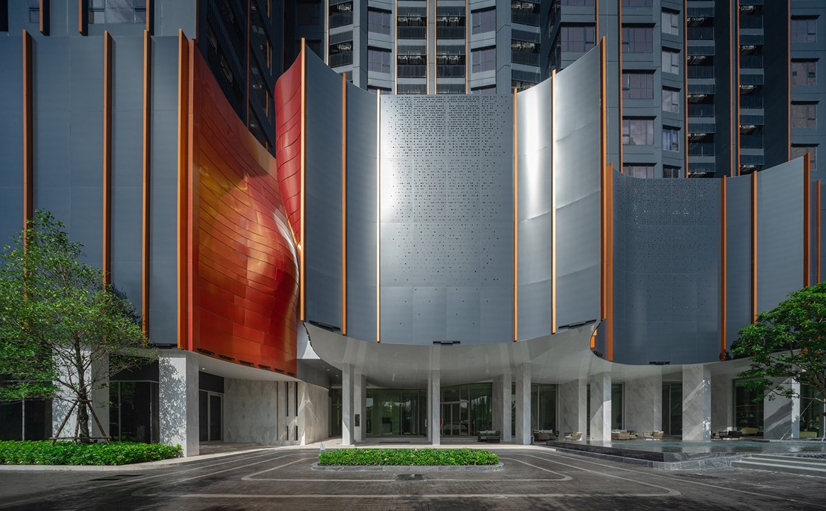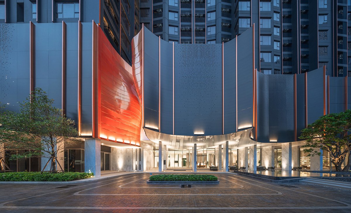 Concept and Massing: The tower’s volumetric articulation is inspired by the layered and curved forms of natural gorges. The façade features copper-colored aluminum panels arranged in horizontal stripes that contrast with a dark bluish base, visually breaking down the building’s scale and leading the observer’s eye upward toward the crown. These panels are both aesthetic and functional, offering partial translucency that mediates natural light penetration and views to the adjacent Chatuchak Park.
