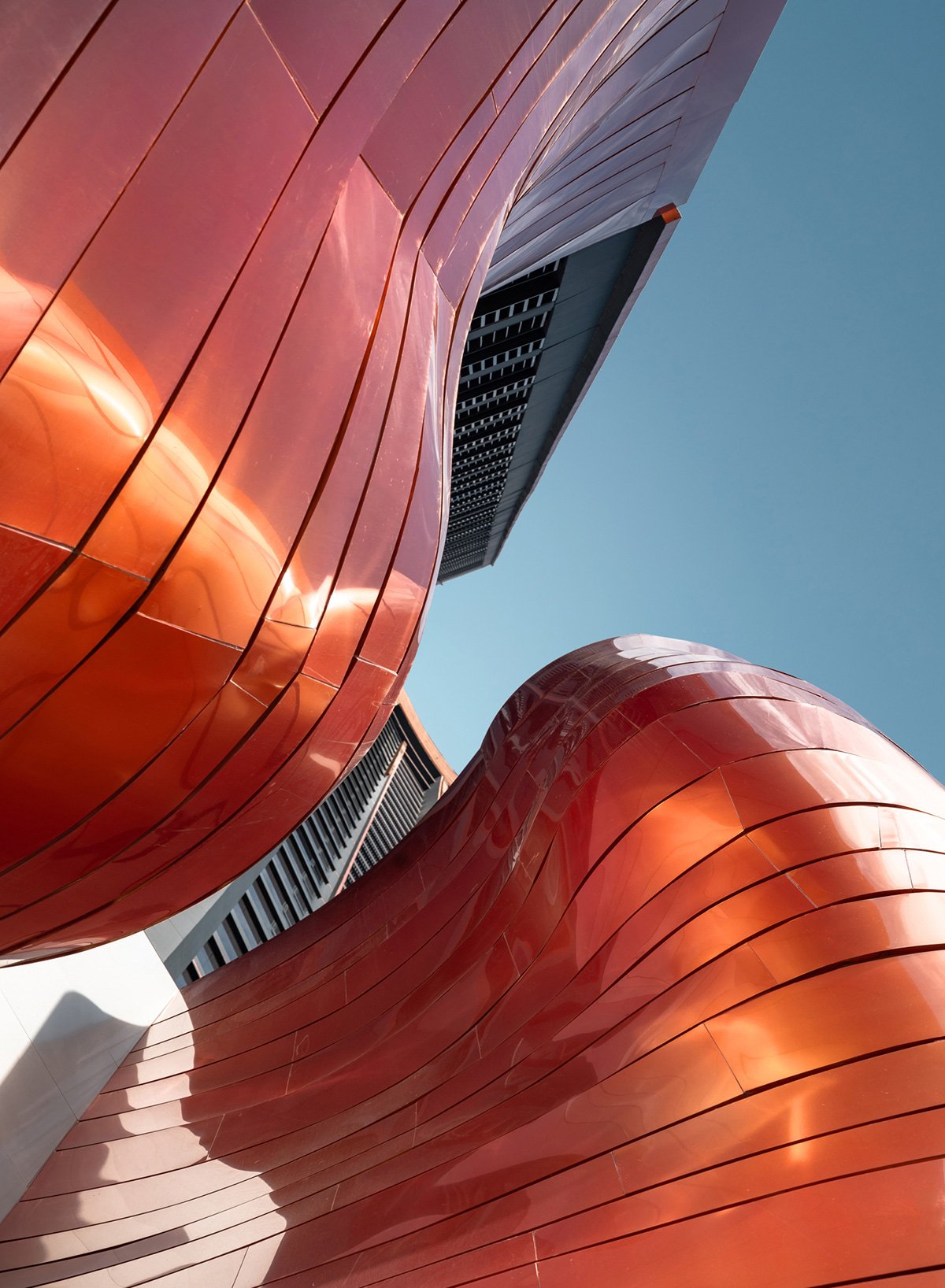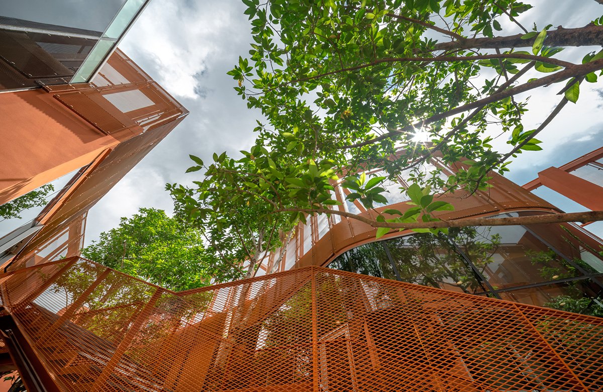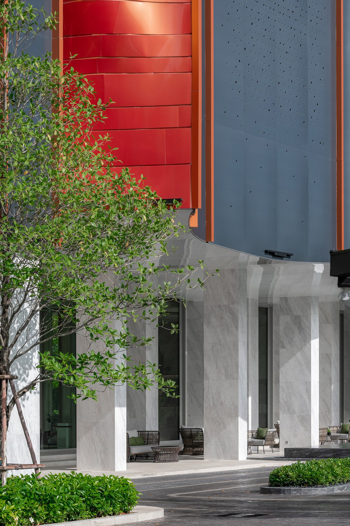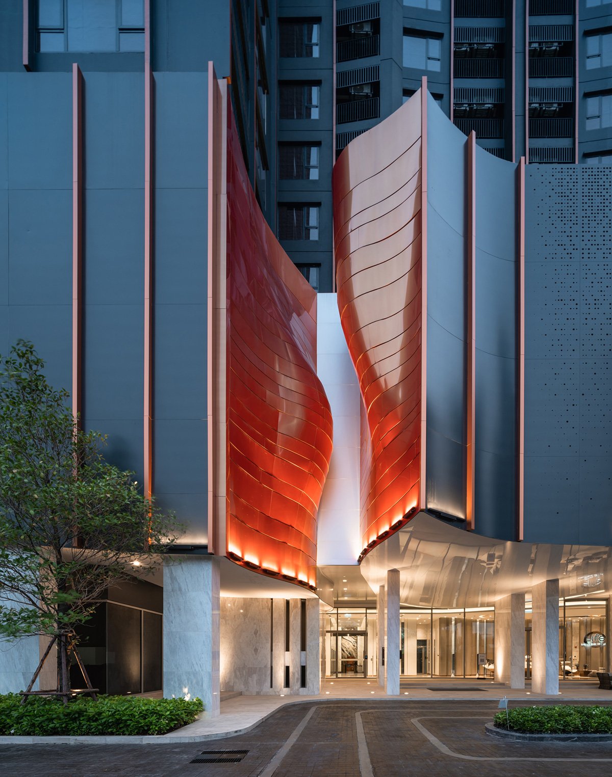 Concept and Massing: The tower’s volumetric articulation is inspired by the layered and curved forms of natural gorges. The façade features copper-colored aluminum panels arranged in horizontal stripes that contrast with a dark bluish base, visually breaking down the building’s scale and leading the observer’s eye upward toward the crown. These panels are both aesthetic and functional, offering partial translucency that mediates natural light penetration and views to the adjacent Chatuchak Park.