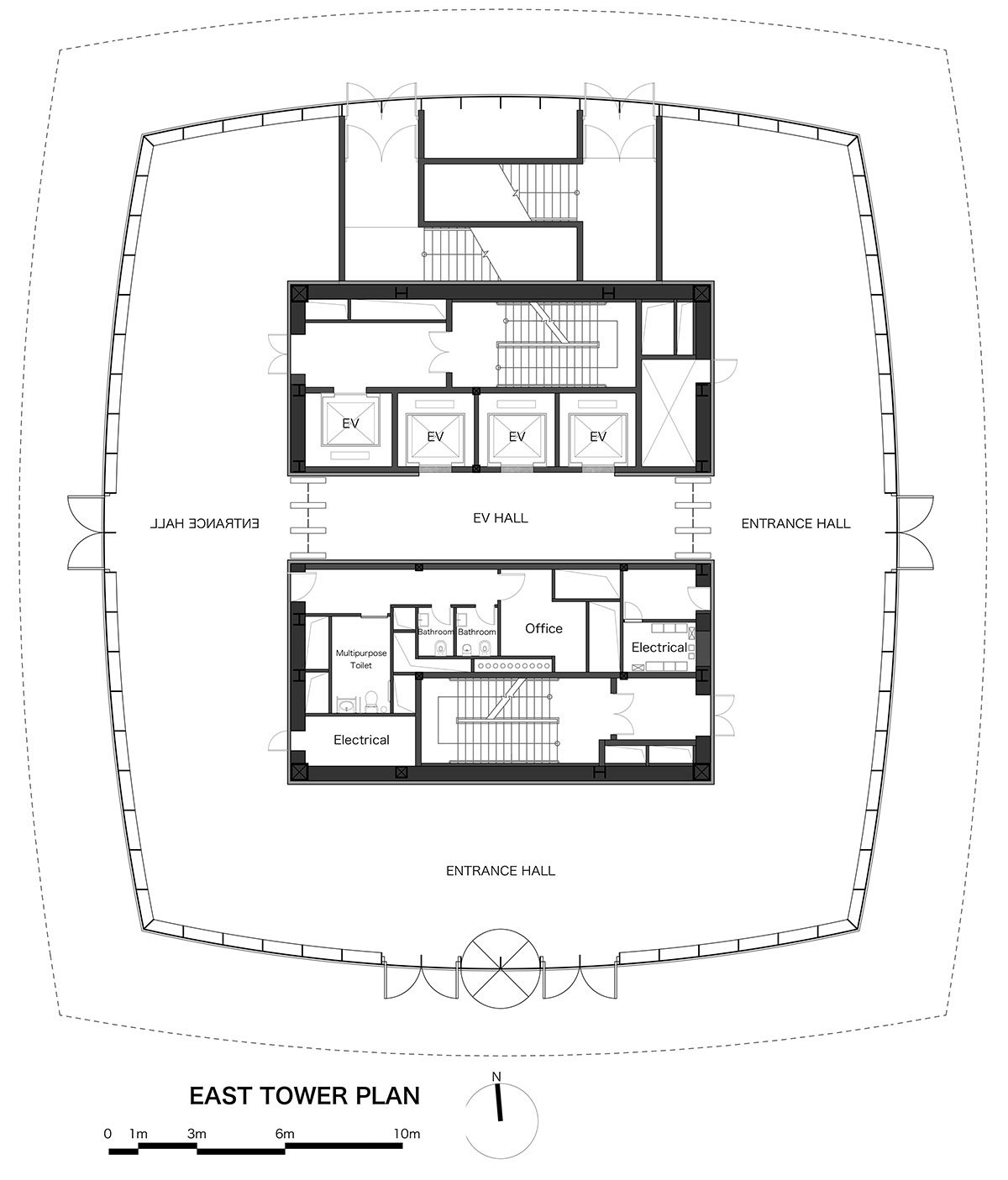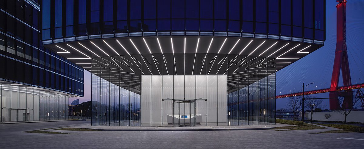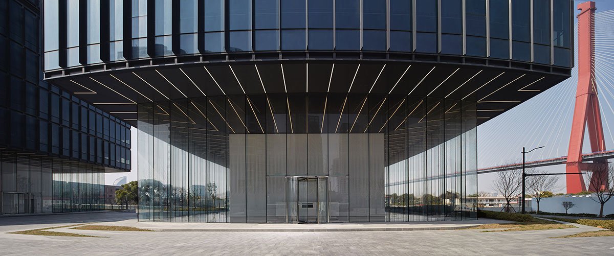 [Text as submitted by architect] This 10-story twin tower on the banks of the Huangpu River in Shanghai is a clear-cut center-core office building. The cantilevered structure extends 9.7 meters from the center core to the curtain wall exterior, and the glass exterior of the entrance hall is set back 3 meters from the perimeter wall.