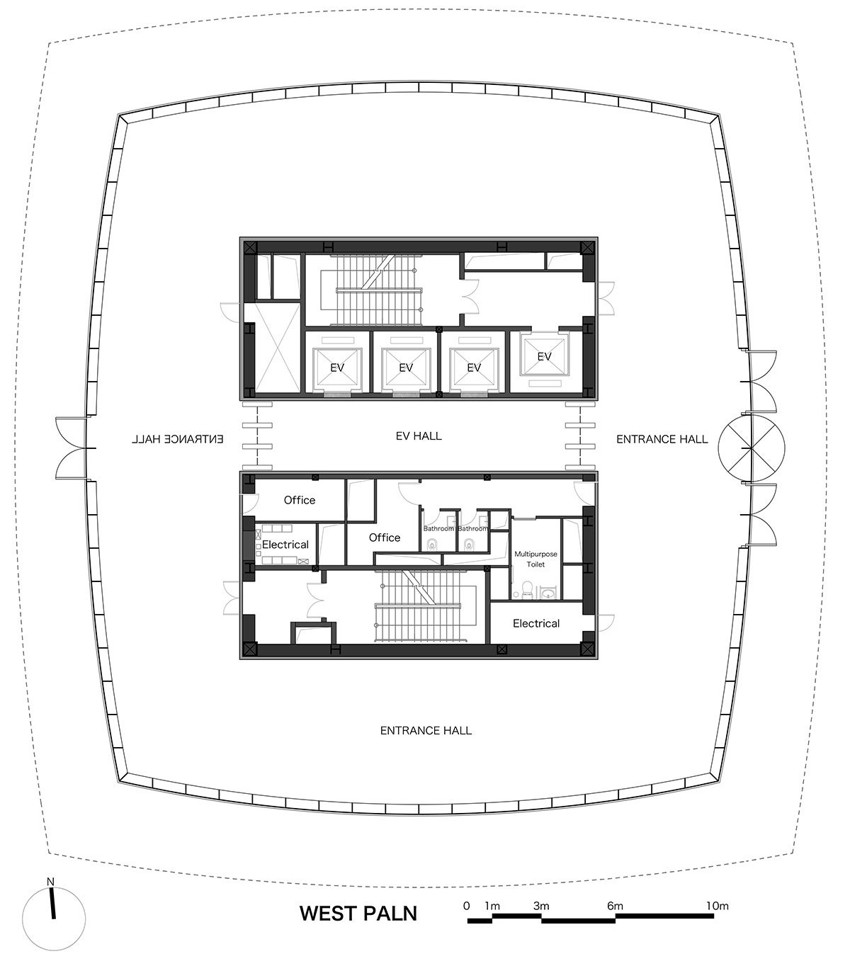 This was intended to insert an organic element into the monotone, transparent entrance hall, and also to ease the tension of the office workers.