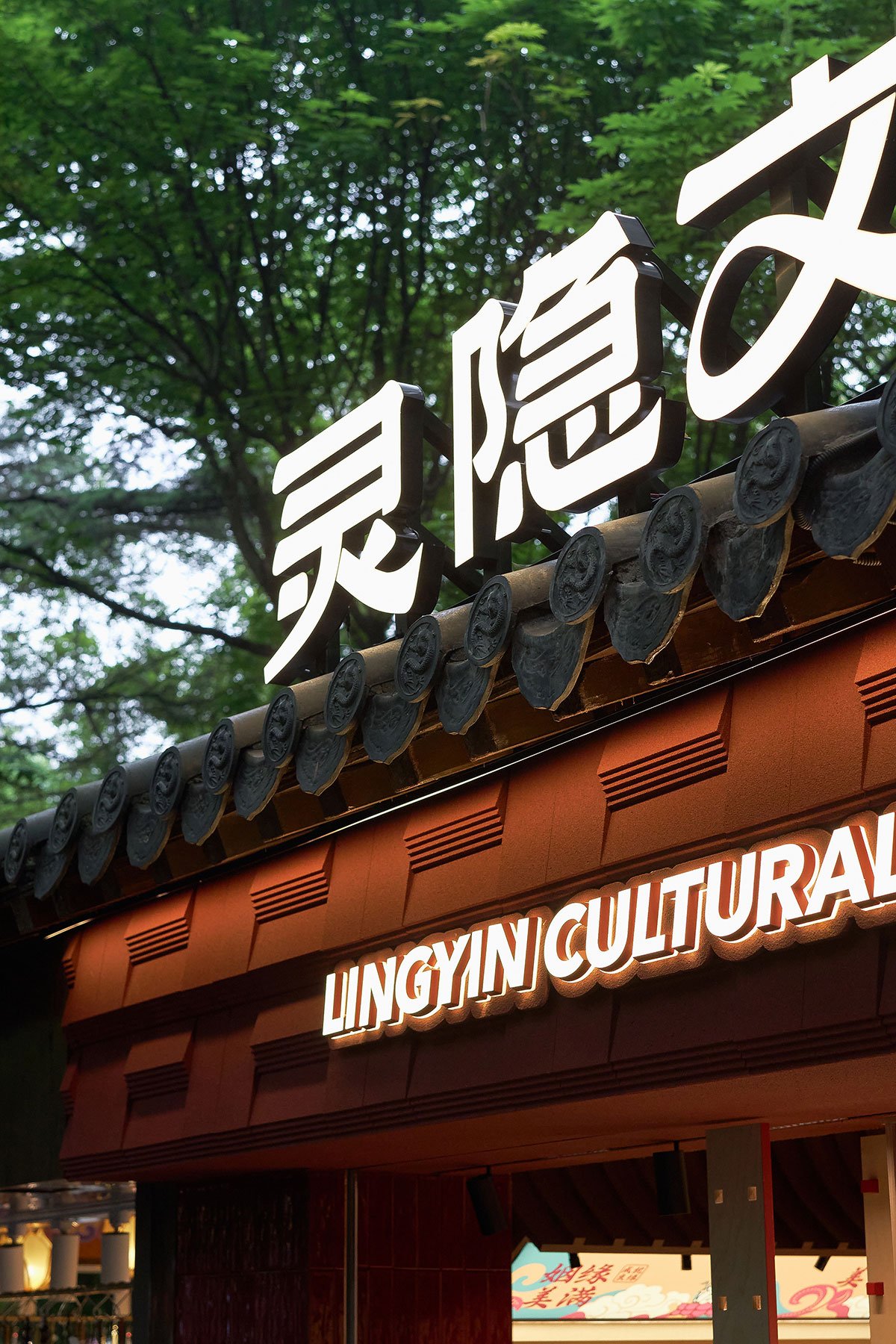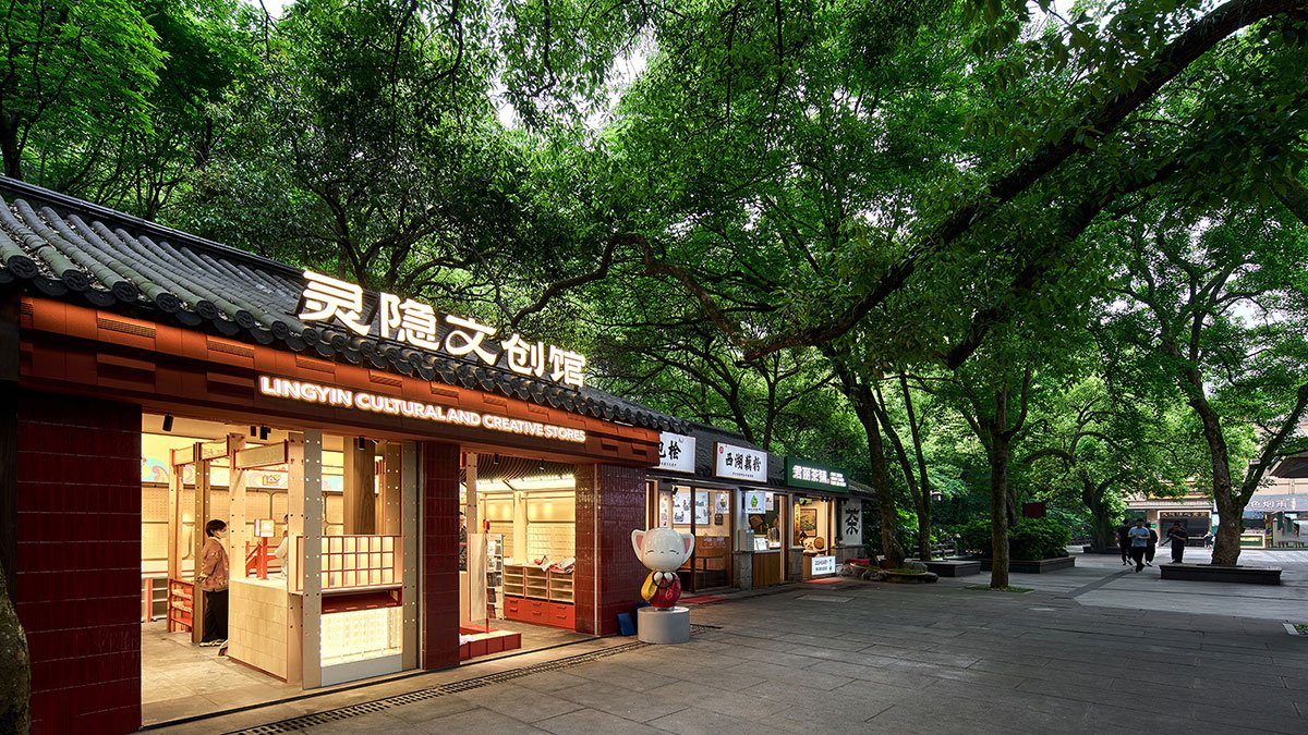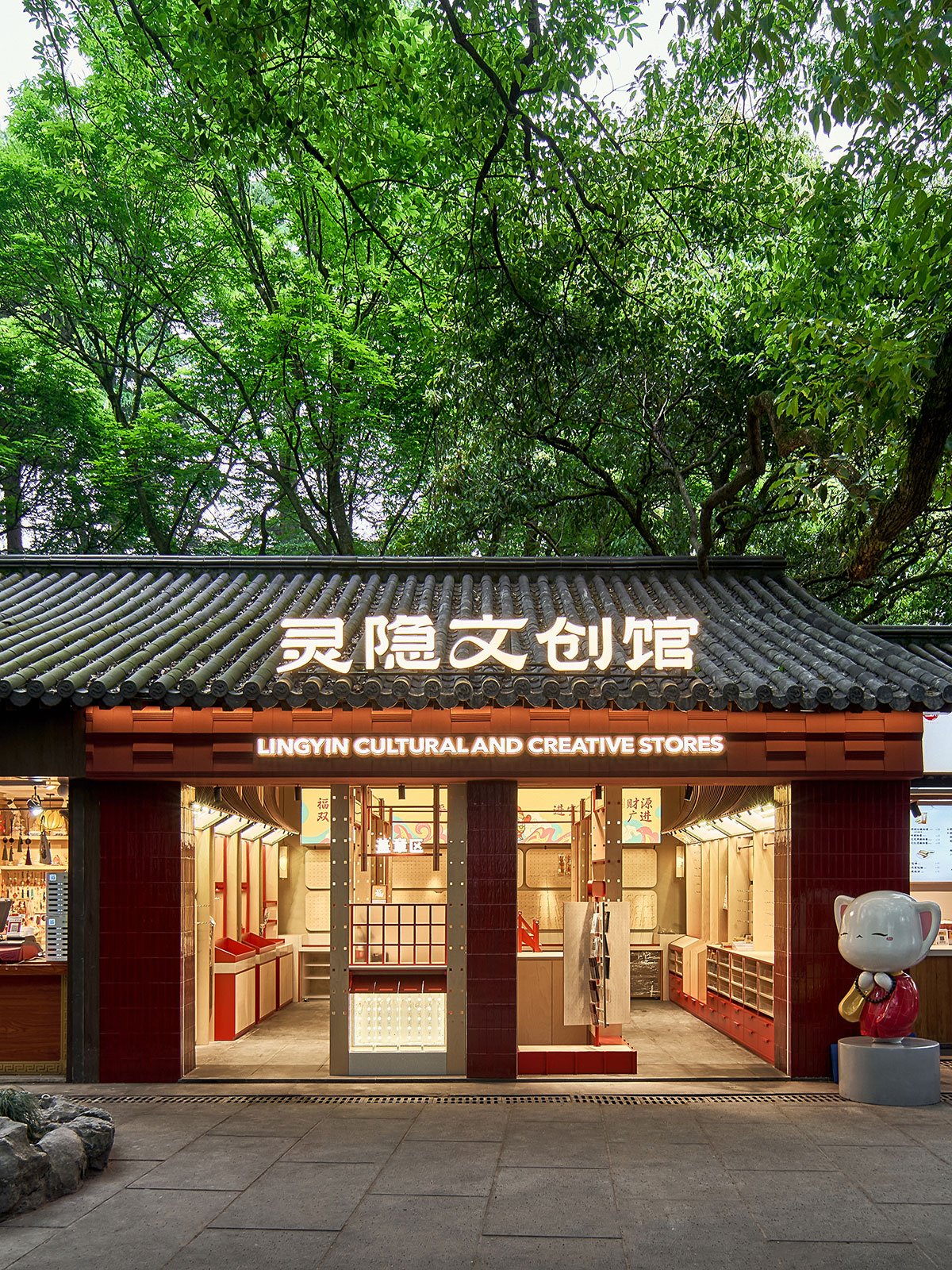 The store’s logo is the highlight of the entrance. Since the shop is located in the Lingyin Temple Scenic Area, it is crucial to attract passing visitors. Therefore, the designers recommended placing the logo above the building. Additionally, the layered red panels enhance the entrance with a modern Chinese aesthetic.