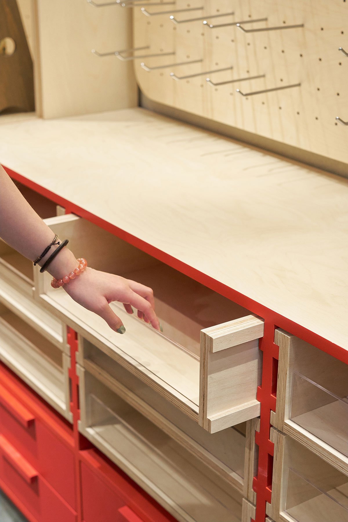 In the design, the designers aimed to recapture the purest form of craftsmanship through attention to detail. Therefore, when designing the storage here, they eliminated conventional metal rails and opted for wooden interlocking joints for the drawers. This approach is intricate and time-consuming compared to modern industrial production methods. By reintegrating this traditional woodworking technique into a contemporary shop, they seek to honor and revive artisanal craftsmanship.