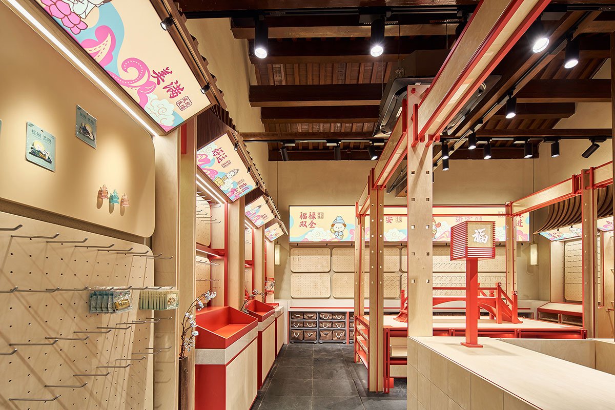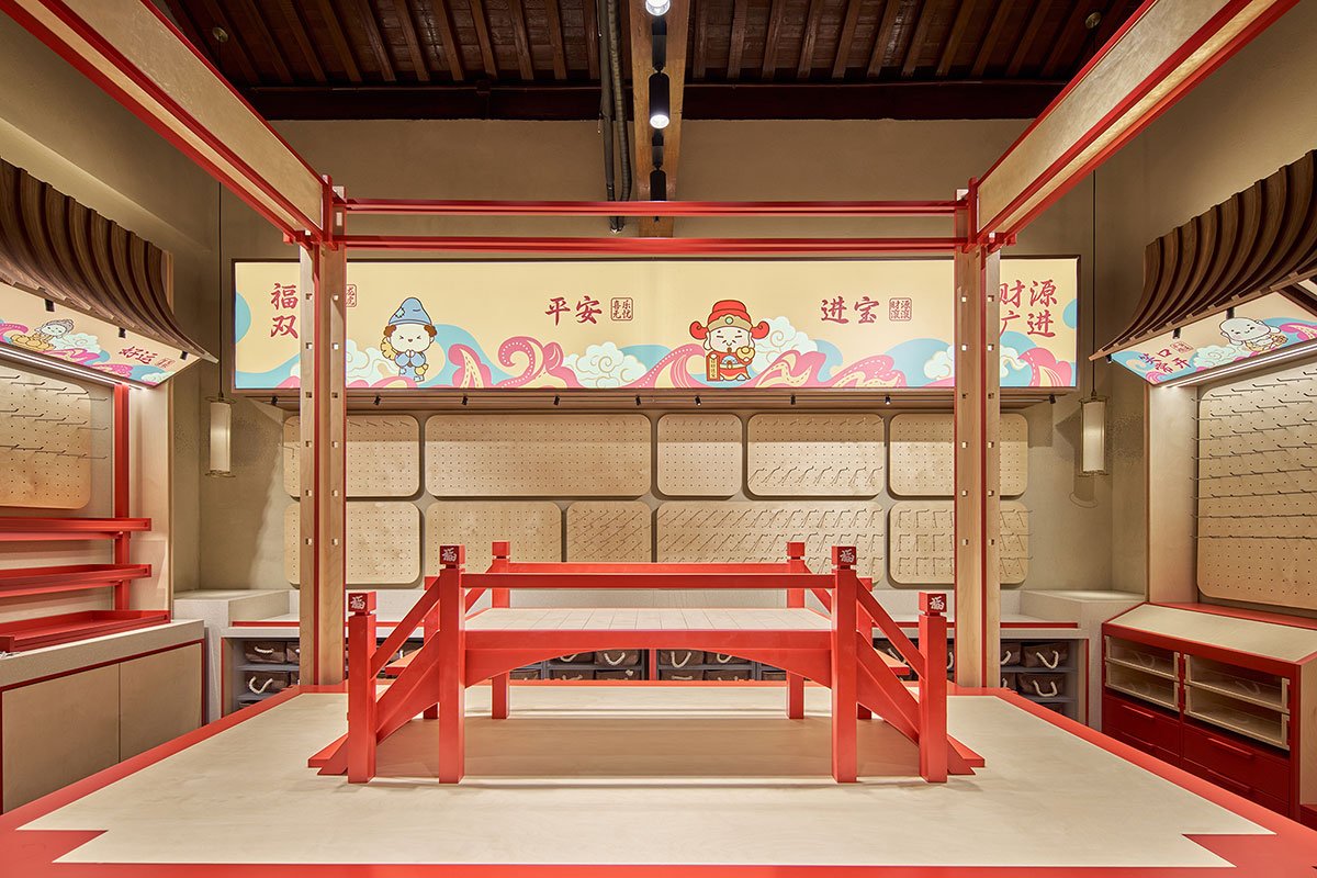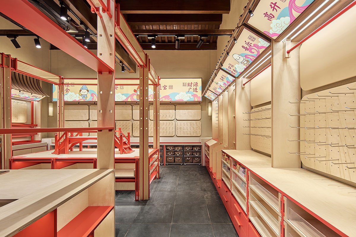 Wooden structures are the mainstream in traditional Chinese architecture, composed of main components such as columns, beams, and purlins. The joints between these components are connected with mortise and tenon, forming a flexible framework. Therefore, in the design, the designers utilized this concept to create a framework structure indoors, which serves the purpose of partitioning while also connecting each area. They also considered how to balance sales and storage, and from the early stages, they decided to use red as the main color theme for the store, aiming to design a cultural and creative shop that breaks conventional norms.