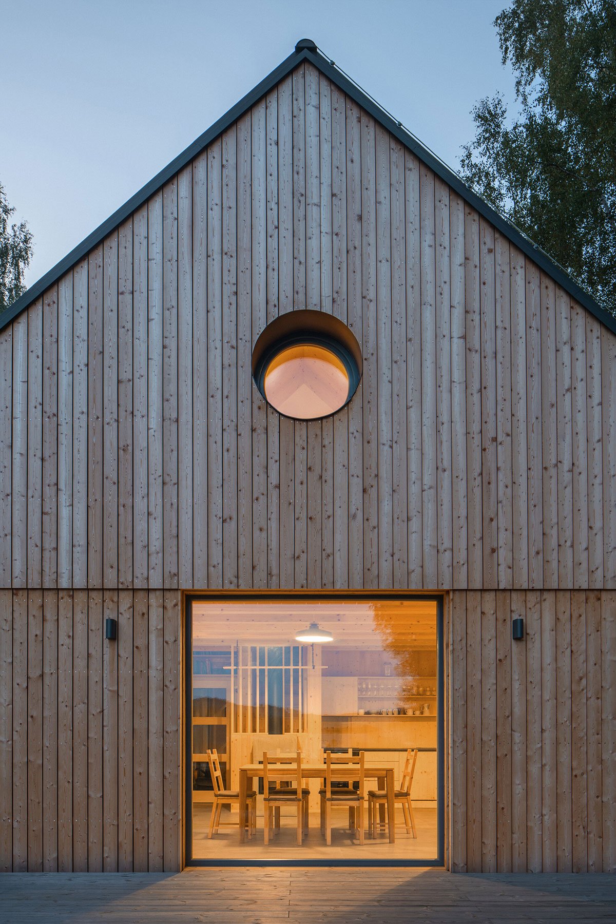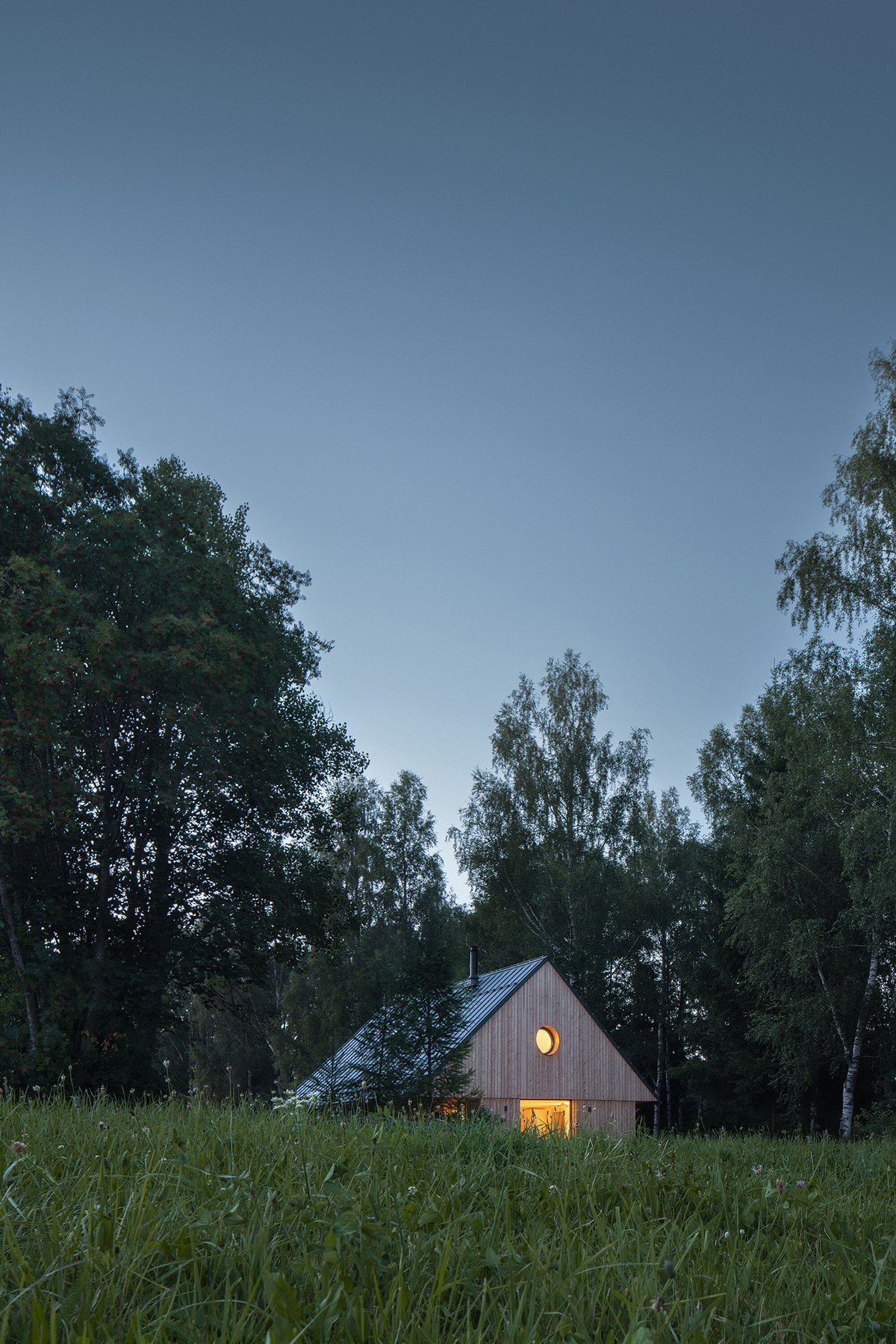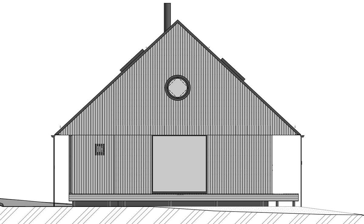 The view of Lipno lake, with two major peaks in the background, becomes the main point of the project. The living space of the house is centered around the dominant gabled square window facing toward the lake. The other windows have a direct view of the forest. The forest is present in the interior as a material, smell, and color. One small room, a bathroom, a laundry room, a small sauna, and a room for storing sports and technical equipment are located on the ground floor. The attic hides a bathroom, a pantry and two bedrooms with a circular window in the gable, framing other peaks in the area.
