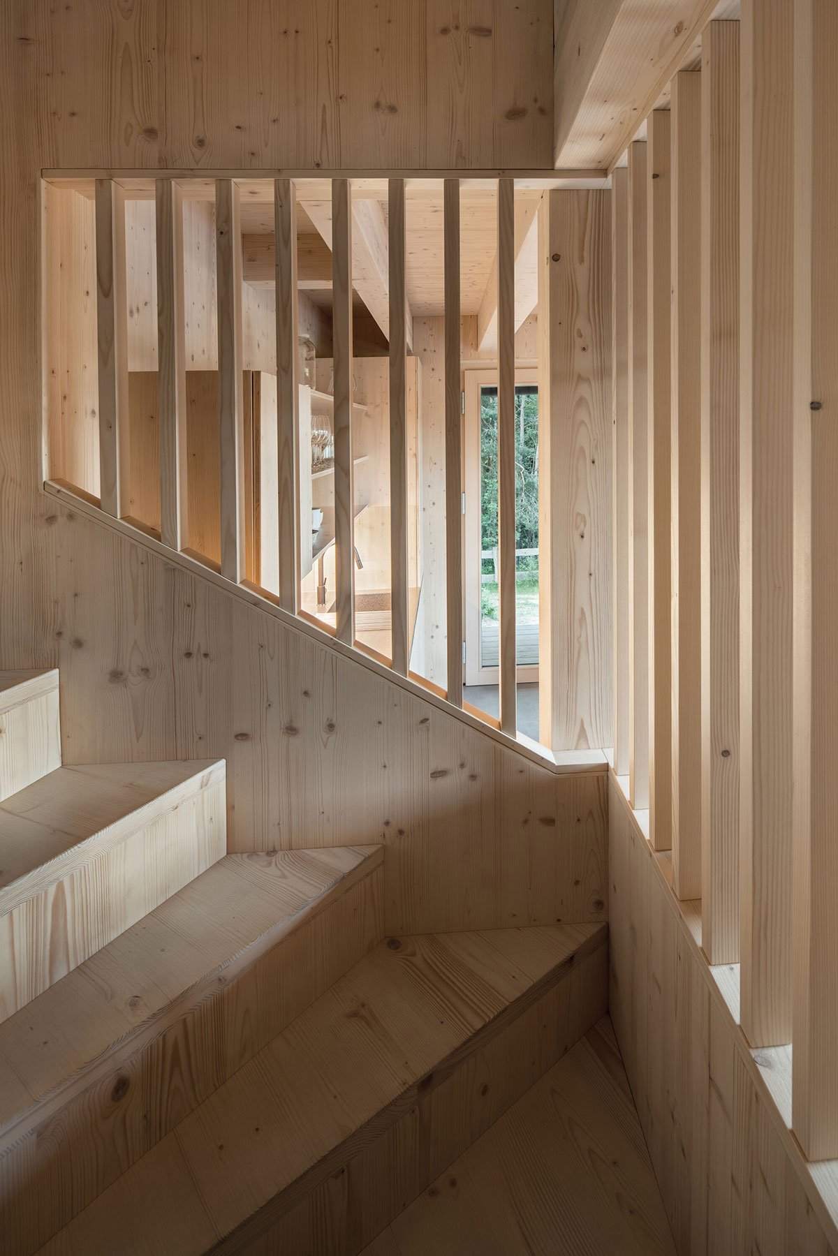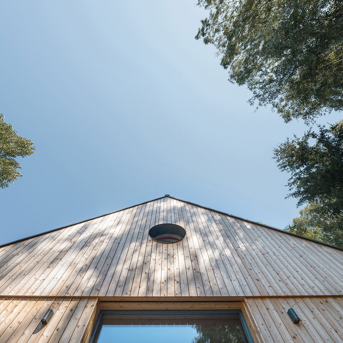 The building is designed as a wooden structure made of CLT panels visible in the interior. The cladding of the facade consists of vertical larch profiles, the windows are complemented by integrated sliding shutters, and the roof is sheet metal. The building was realised by a family company 3AE which worked in close collaboration with the author. Besides the final quality of the building, they also ensured a high level of detailed execution. Shared values, a sense of detail and an appreciation of natural materials make the final result resonate.