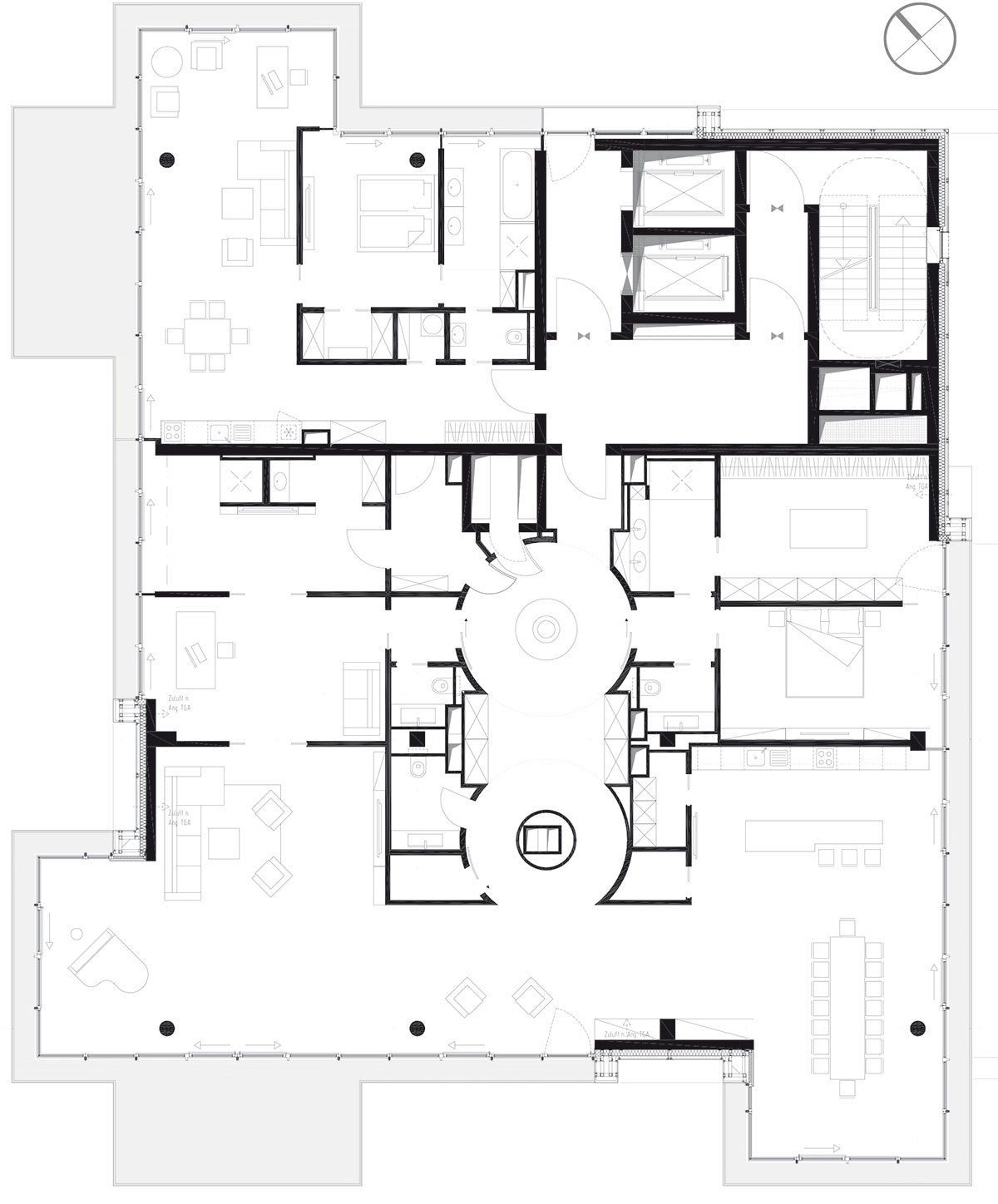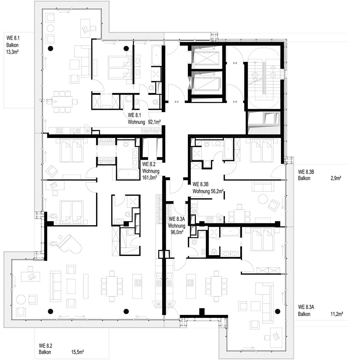 The project contains 56 spacious apartments of various sizes and 1 commercial unit. Due to the rotationally symmetric arrangement each apartment has its own private outdoor area with a wide or a panoramic view of two directions. Based on the reinforced concrete skeleton construction, flexible layouts of the floor plans (54 and 434 square meters) allow the inhabitants to design their apartments based on their own preferences.