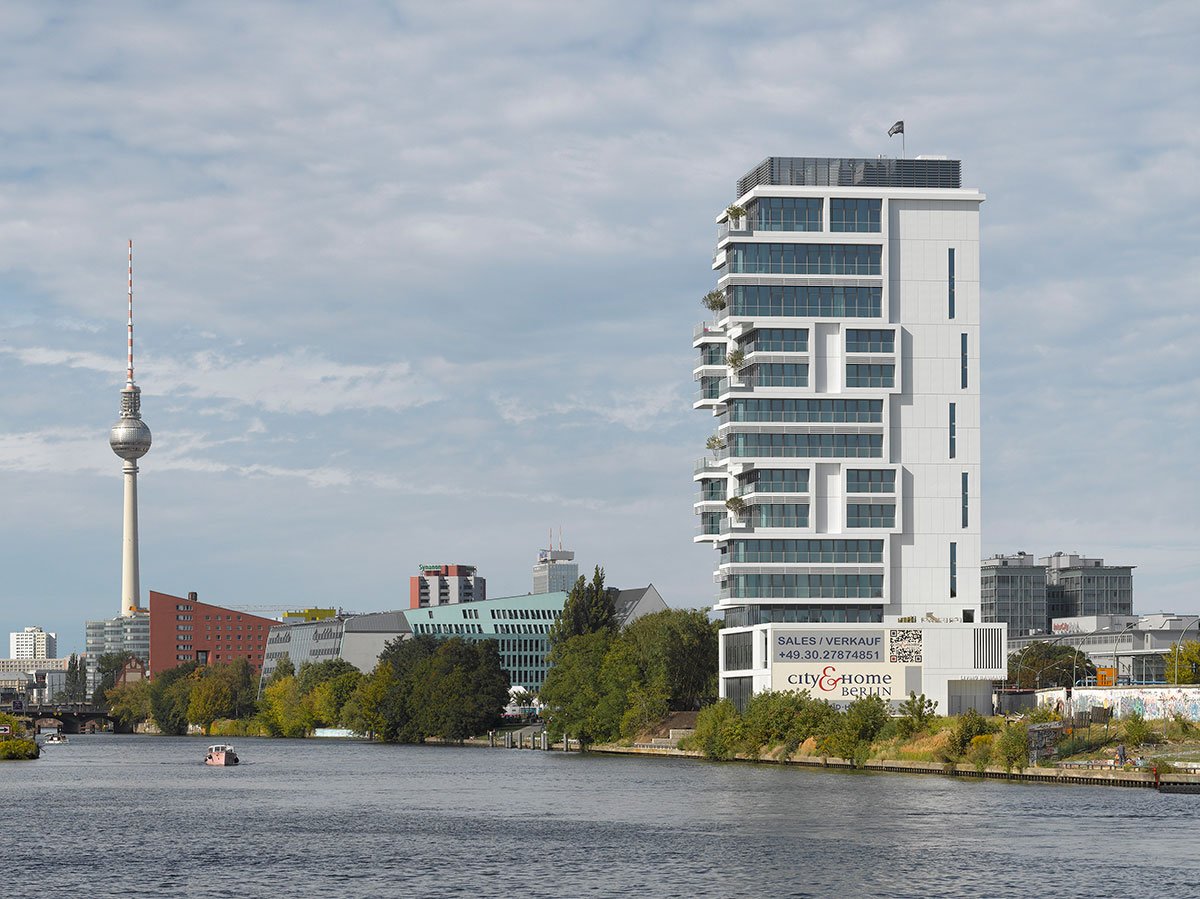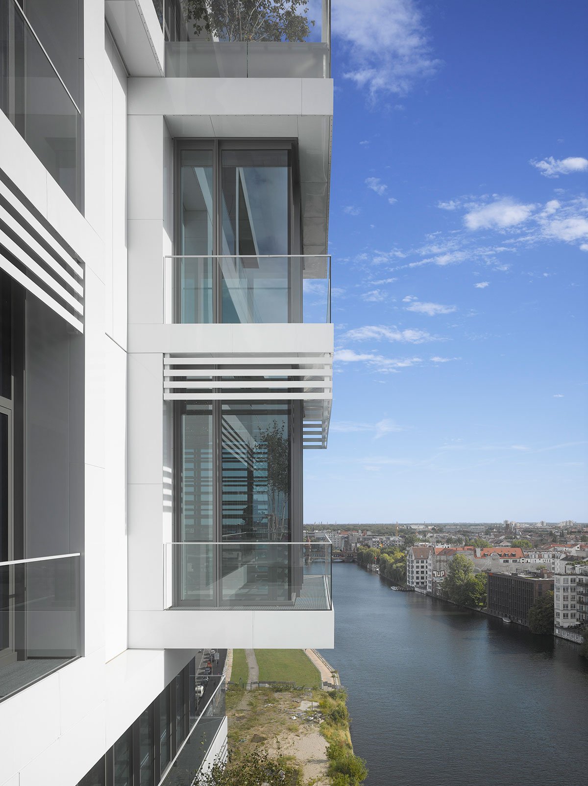 The relief-like details, which are visible from all angles, provide a visual attraction with the variation from hollow volumes to cantilevers. Being set on a concrete pedestal, which is clad with metal panels, the facade of the tower is emphasized by its generously glazed surface. The transition between the public and the private area is rather smooth including a public café at the Spree-promenade. Children’s playgrounds are located on the roof of the 1st floor as well as on the terrace along the boardwalk. The two-story shaped entrance hall is also used as a gallery.