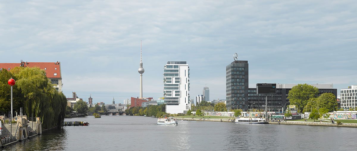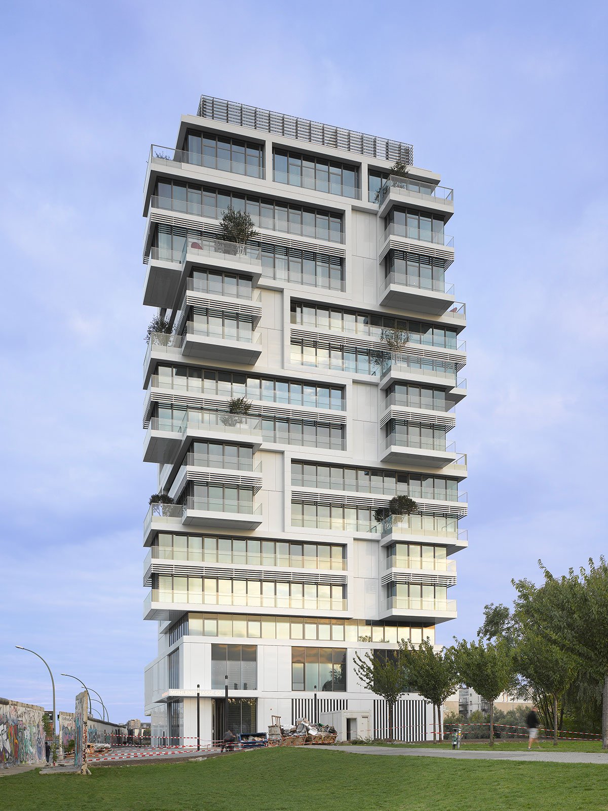 This multi-storey apartment building is a part of a recently built extension along the river bank. Due to its location at the head of the former Brommy-bridge, this white solitary building is directly on the water overlooking the Spree promenade. The building is formed out of sculptural elements whose manifold functions appear to be visibly stacked.