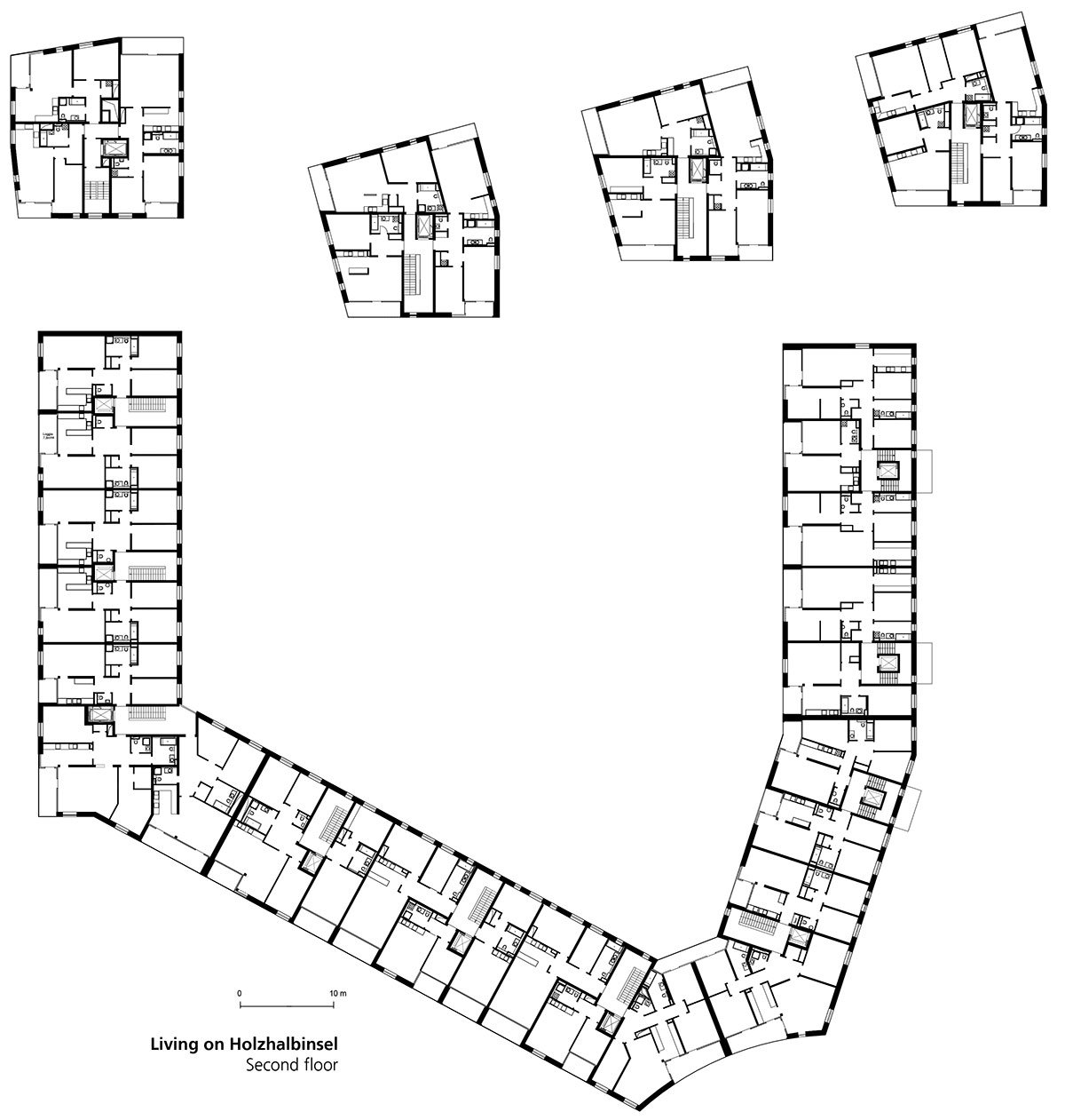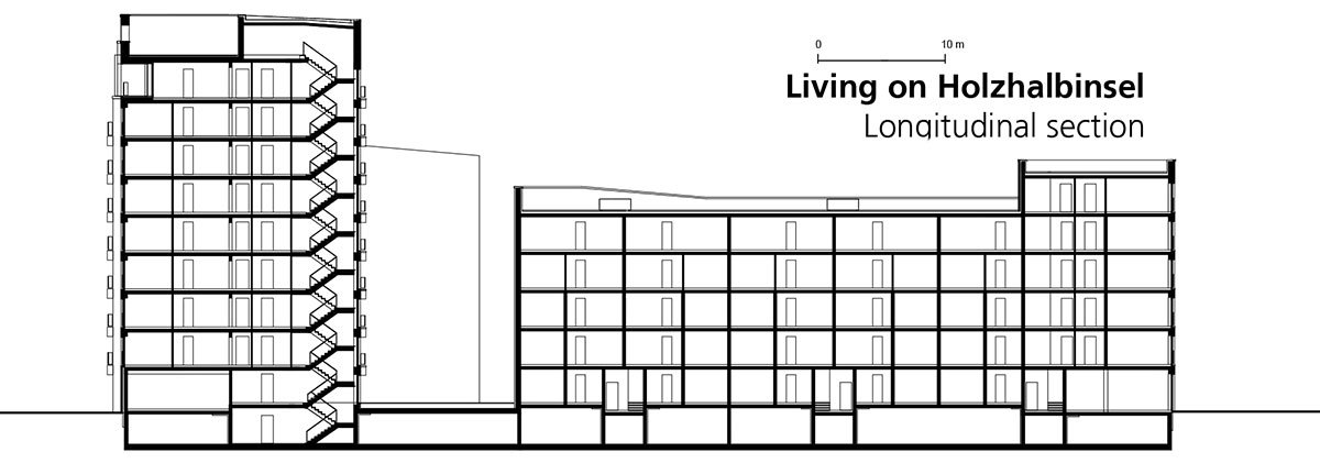 Excerpt: Living on Holzhalbinsel, a housing project by Tchoban Voss Architekten, captures the movement of wind and water through dynamic, angular architecture. The buildings’ shapes and rooflines respond to the prevailing wind direction, creating a sense of motion and lightness. A central U-shaped structure anchors the ensemble, while varied building heights and a prominent tower add rhythm and identity.