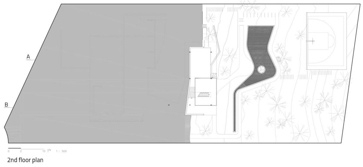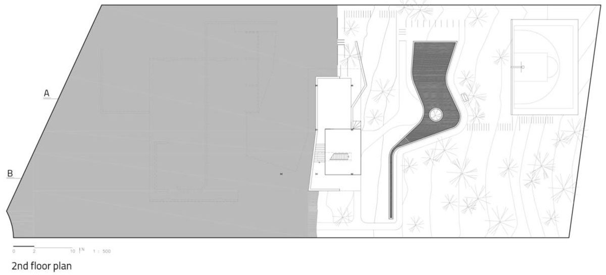 [Text as submitted by the Architects] Situated on a site with a large number of native trees to be preserved and average slope of 30%, the implementation of the project suggests an intense dialogue with the existing topography and vegetation.