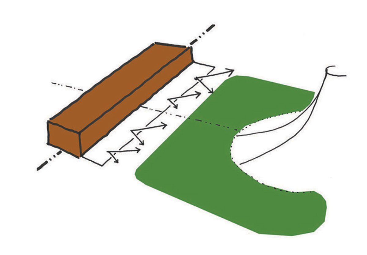 The temple is laterally centered on site but sits 85 meters away from the entrance giving it an appropriate foreground to appreciate its sacredness and beauty. It is a destination of a journey across the grounds, from the mundane to the sacred. The Temple soars from the ground like a tall tree with roots anchoring it to the surroundings. Mounds of landscape slope upwards, sheltering the prayer hallyet allowing glare-free light inside. The slim concrete ribs of the temple shaped from a catenary curve add grace and loftiness. The roof has a thin concrete shell core. Its hyperboloid shape gives natural strength, making construction cost effective.
