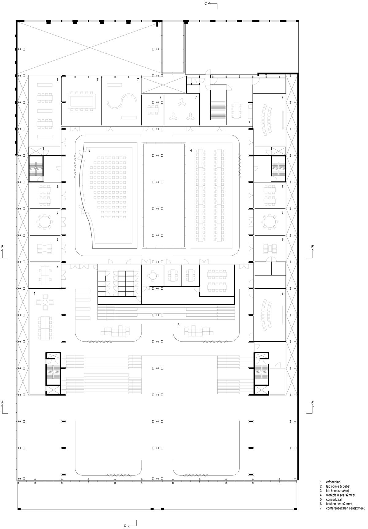In addition to various areas for lectures and public events, the library has a number of ‘labs’ (laboratories) where visitors can learn new skills. These labs, with their remarkable design, can be found throughout the building. One is in the form of a glass cube, formerly part of the concert hall in Amsterdam’s Beurs van Berlage building. There is also the Food Lab, the Word Lab, the DigiLab and the Heritage Lab. The clustering of libraries, various arts institutes, Seats2Meet and faculties of journalism in the nearby Mindlabs (currently under construction) creates a diverse group of experts who will cement the success of the new library concept. Moreover, the form of the building ensures that the collection, the facilities and the manner in which they are used can be adapted to meet changing requirements.