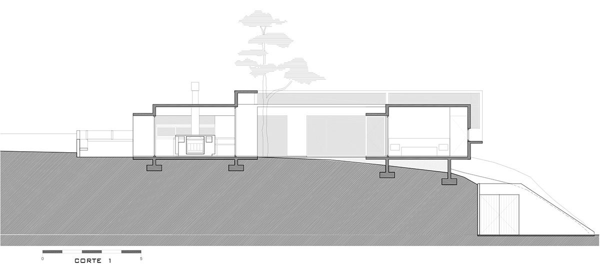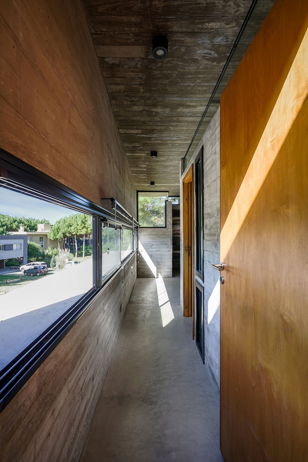 In a corner of the courtyard, and barely insinuated by an eave, is the entrance door to the social area with all integrated uses (living, dining, kitchen) and determined according to the type of concrete equipment proposed. Turning, and through a corridor visually integrated with the courtyard, one enters the secondary bedrooms and the general bathroom. At the end of the path, announced by a light entrance, the master bedroom is accessed with views of the street through a low horizontal opening along the entire suite. Finally, and through a large window one can go out to the courtyard and start the tour again. In addition to the access through the staircase, another secondary access has been planned with quebracho boards on the natural terrain to enter directly to the outdoor activities area under the grove.