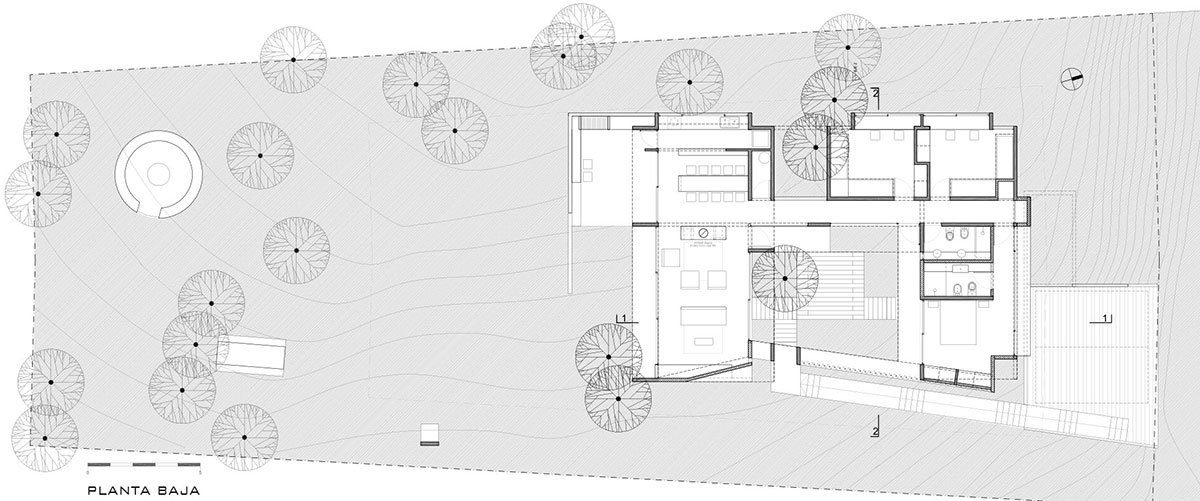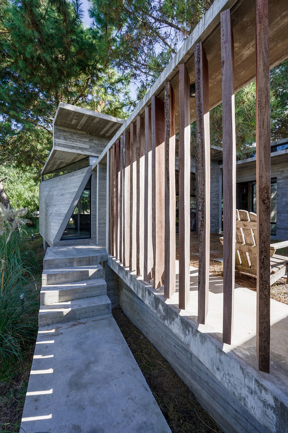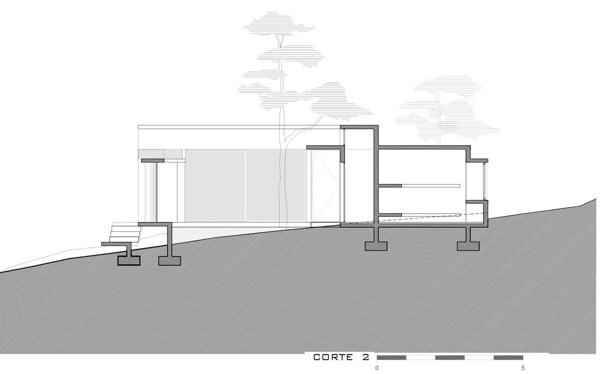 In order to respond to the situation created by the significant unevenness between the lot and its surroundings, without making changes to its topography and respecting all the existing trees, it was proposed to create a pedestrian path that would take advantage of the initially adverse conditions. The route begins at the foot of a comfortable staircase with five landings, which runs along almost the entire sloping side with the lowest adjoining lot. At the end of the ascent and through a doorway one enters a courtyard. A space that is insinuated by a series of quebracho boards in vertical position, while climbing the stairs. An organizing space for the whole house that, sheltered from the gaze of the neighbors, provides privacy and expansion to the most important rooms of the house.