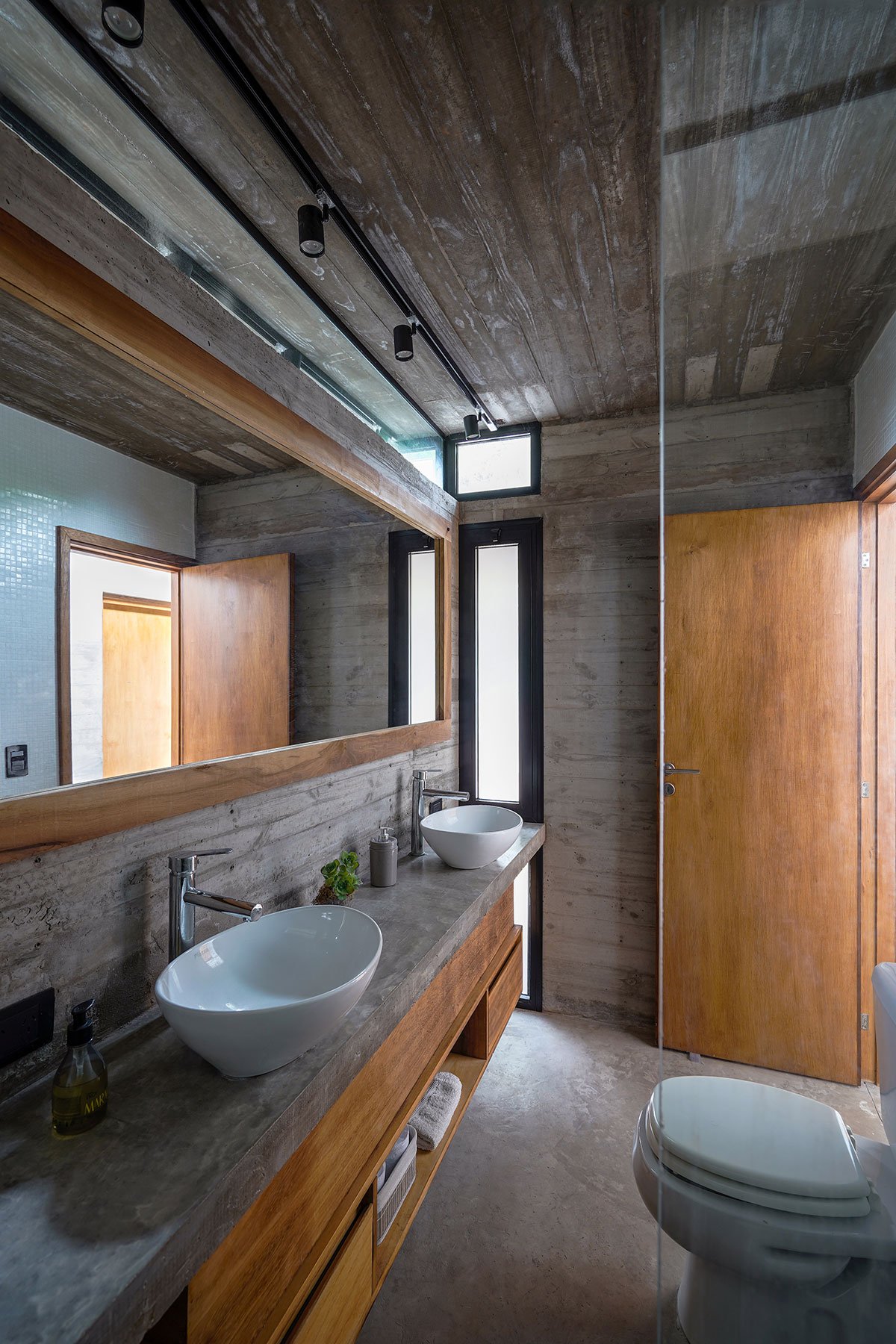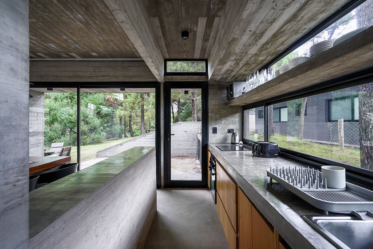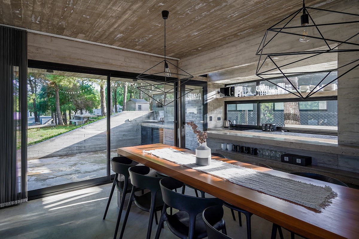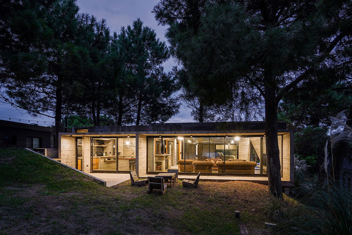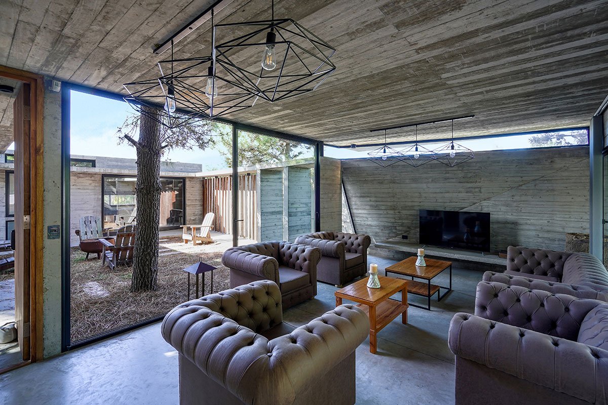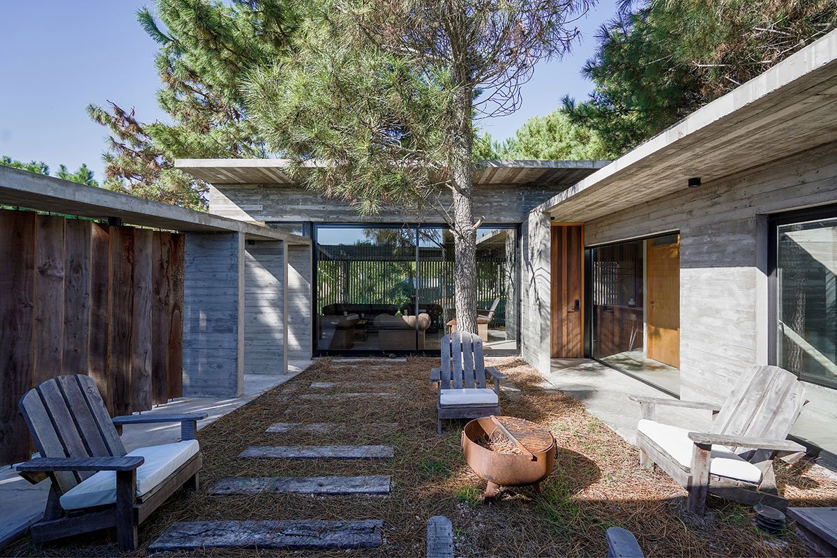 Excerpt: Loma House by Besonias Almeida Arquitectos, a summer house entirely built in exposed concrete, features a pedestrian path to address unevenness in the lot and surroundings. The path leads to a courtyard, surrounded by quebracho boards, providing privacy and expansion to important spaces. This approach, without altering the lot’s topography, respects existing trees and allows for a more organized space.