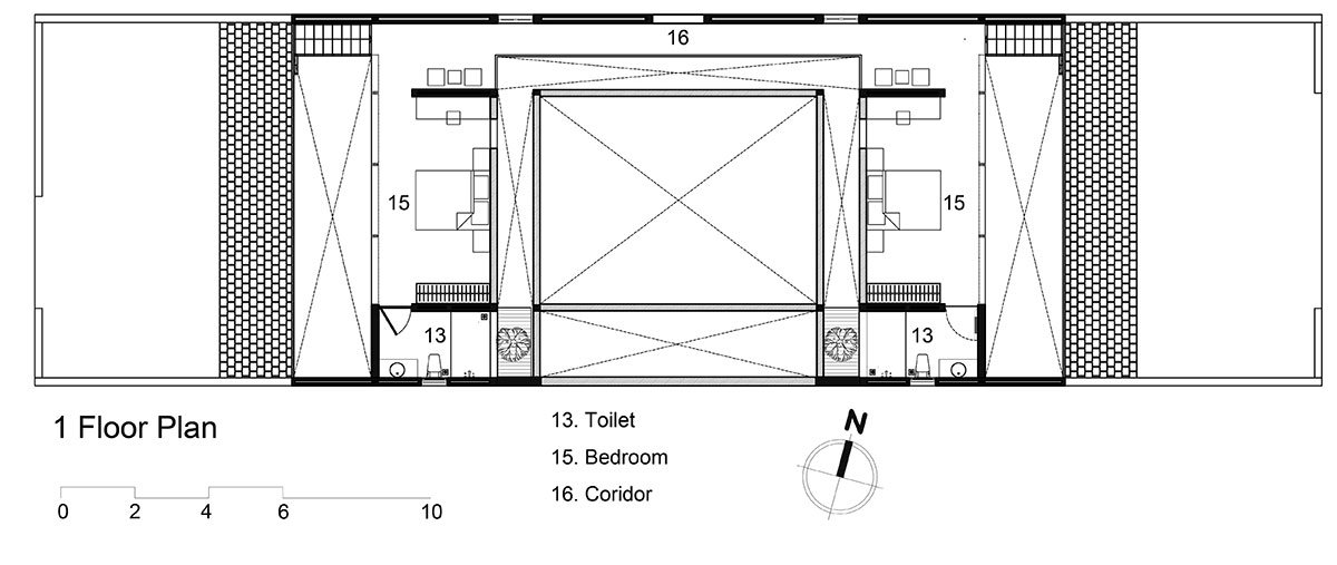 The kitchen area and other functional spaces are located on the north side and go along the house, which is an advantage to traditional cooking when many family members come and visit. The mezzanine accommodates two bedrooms, a relaxing and reading area and a long corridor connecting all spaces in the house through two stairs on both ends.