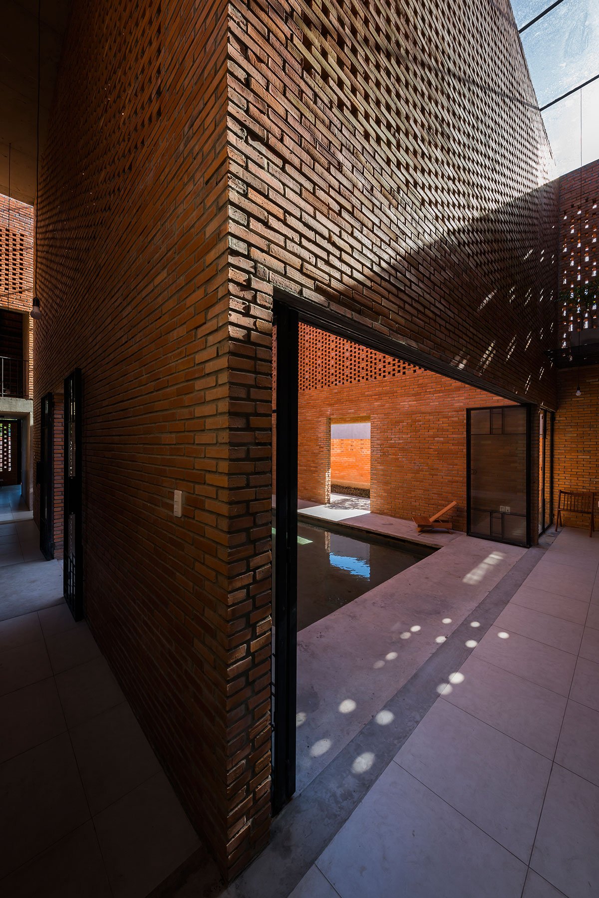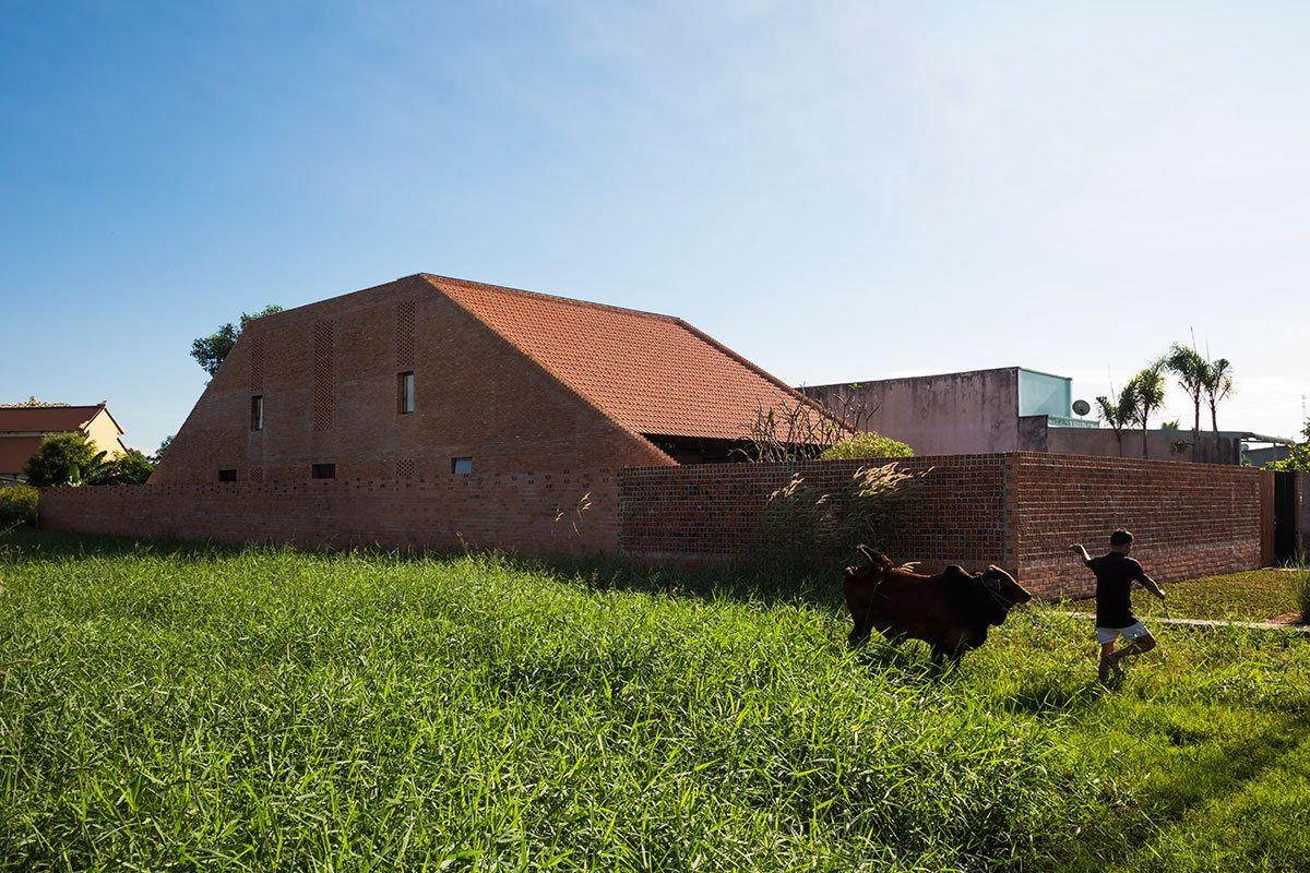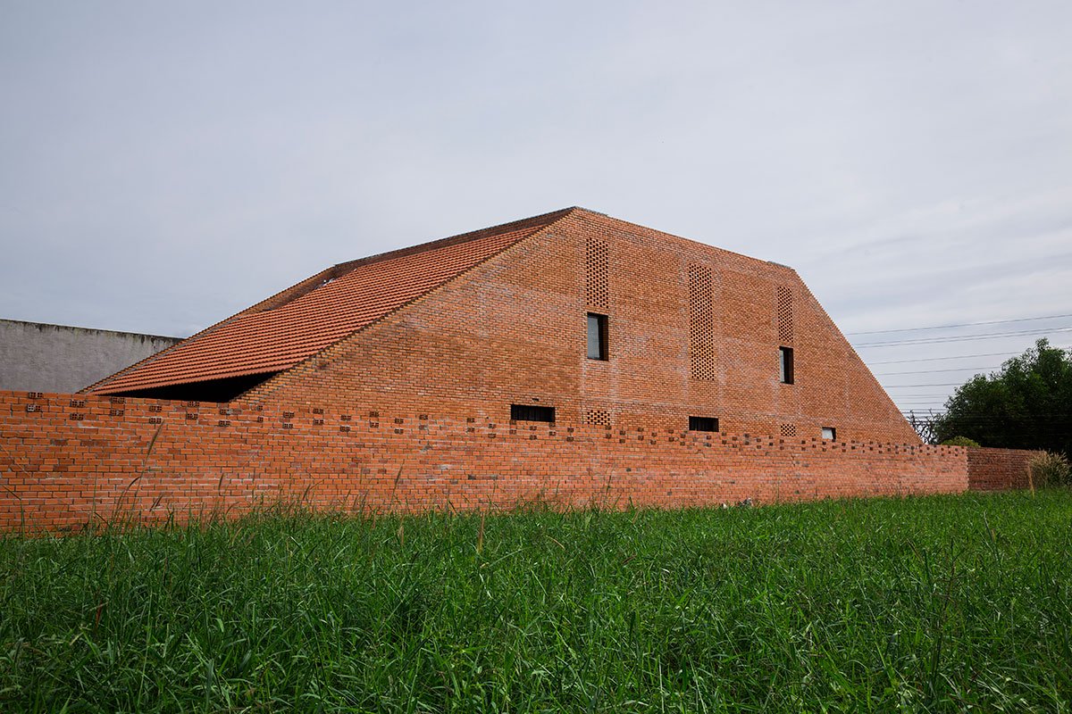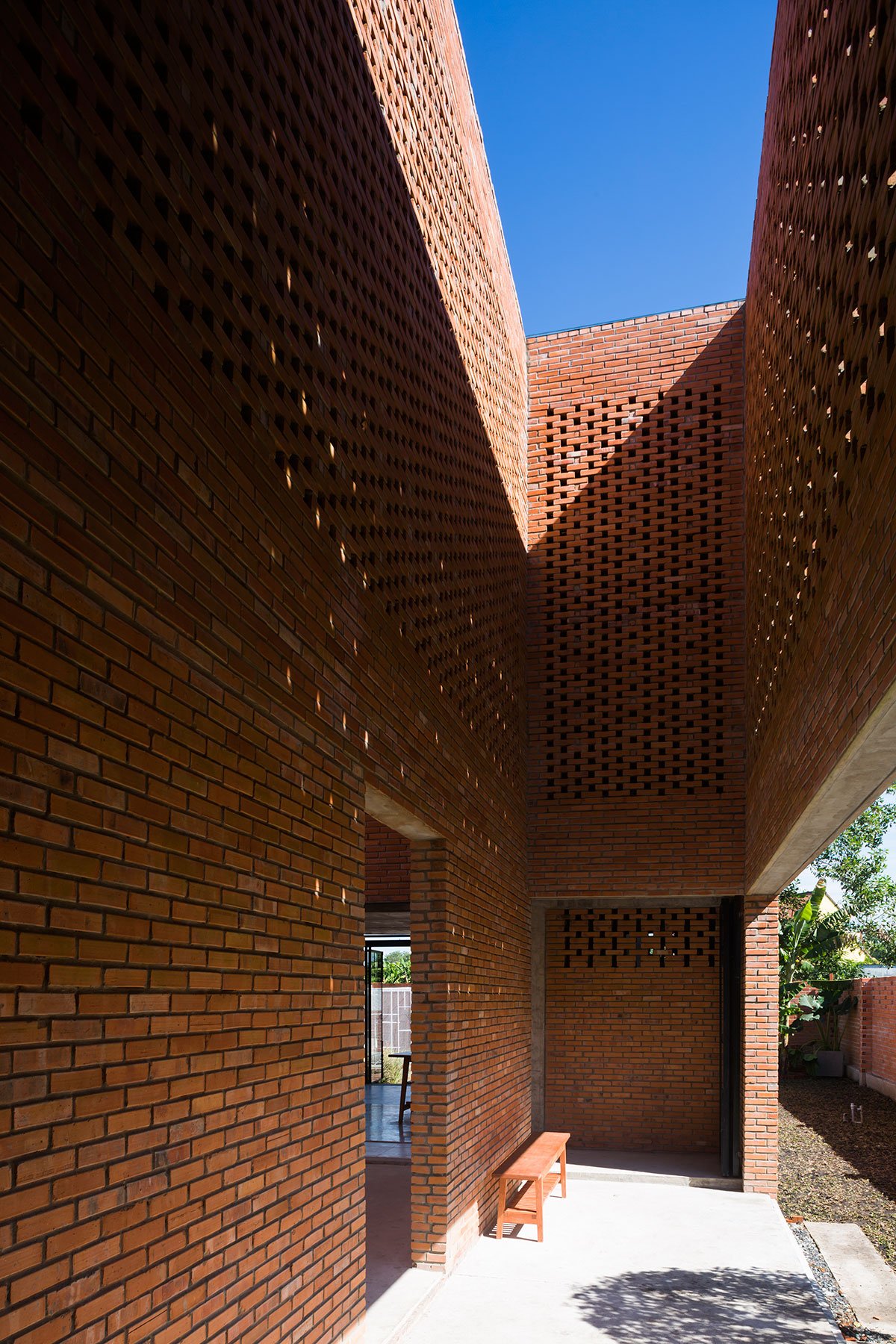 [Text as submitted by architect] The architects were inspired by the traditional house and wanted to design a house with the traditional structure accompanied by 3 separate spaces and slope roof, but using a modern and strong architectural language. At the same time, maximizing the ventilation efficiency by dividing the roof into two parts and having a courtyard; then allocating two corridors to connect the roof. This way created a courtyard and big walls. These are porous walls which can bring breeze into the house.