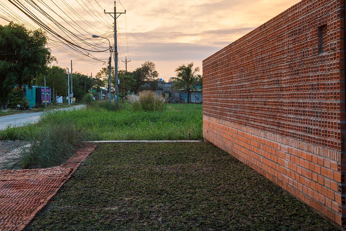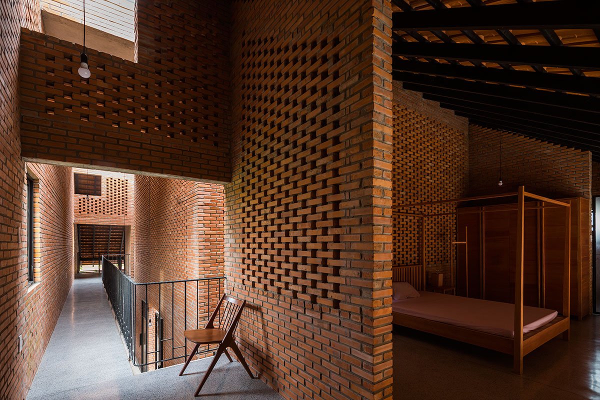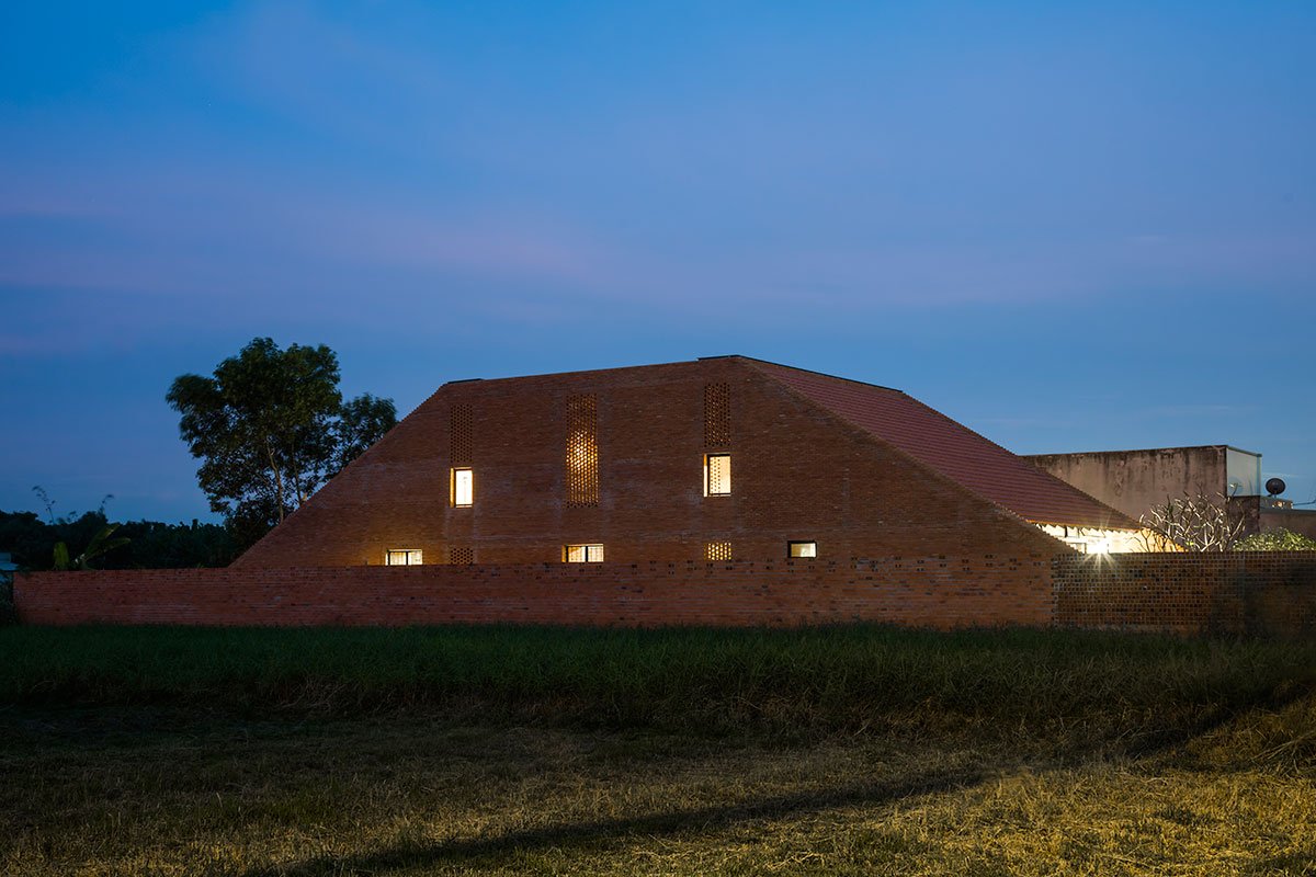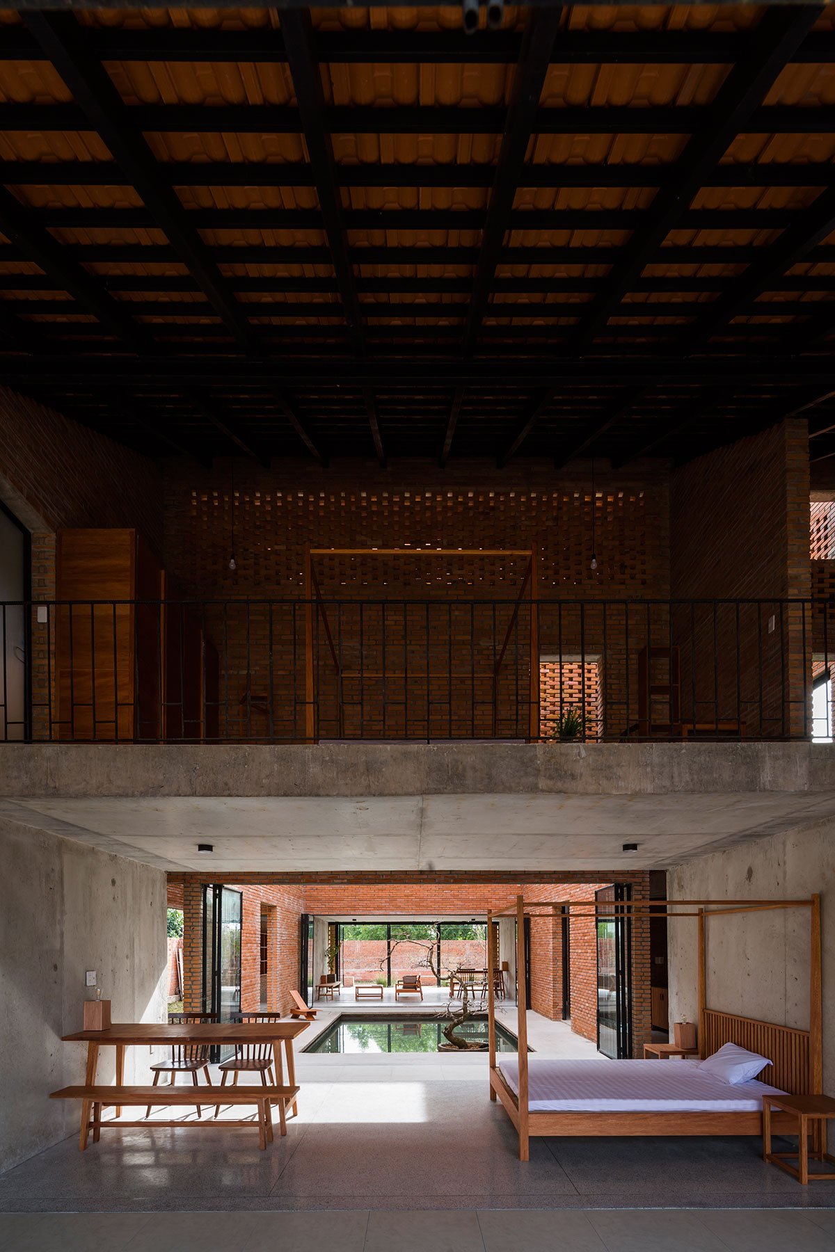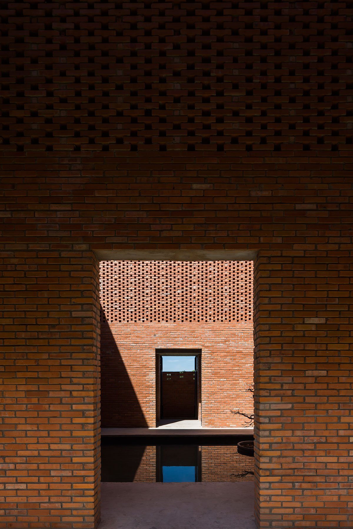 [Text as submitted by architect] The architects were inspired by the traditional house and wanted to design a house with the traditional structure accompanied by 3 separate spaces and slope roof, but using a modern and strong architectural language. At the same time, maximizing the ventilation efficiency by dividing the roof into two parts and having a courtyard; then allocating two corridors to connect the roof. This way created a courtyard and big walls. These are porous walls which can bring breeze into the house.