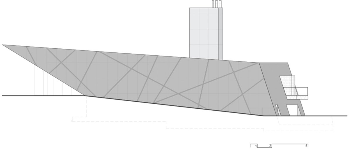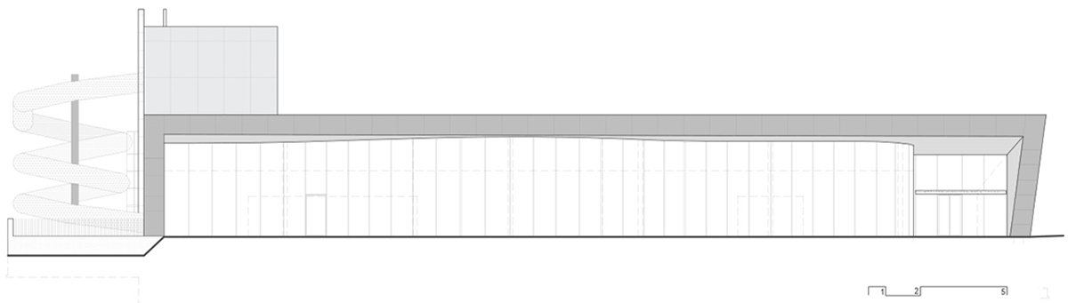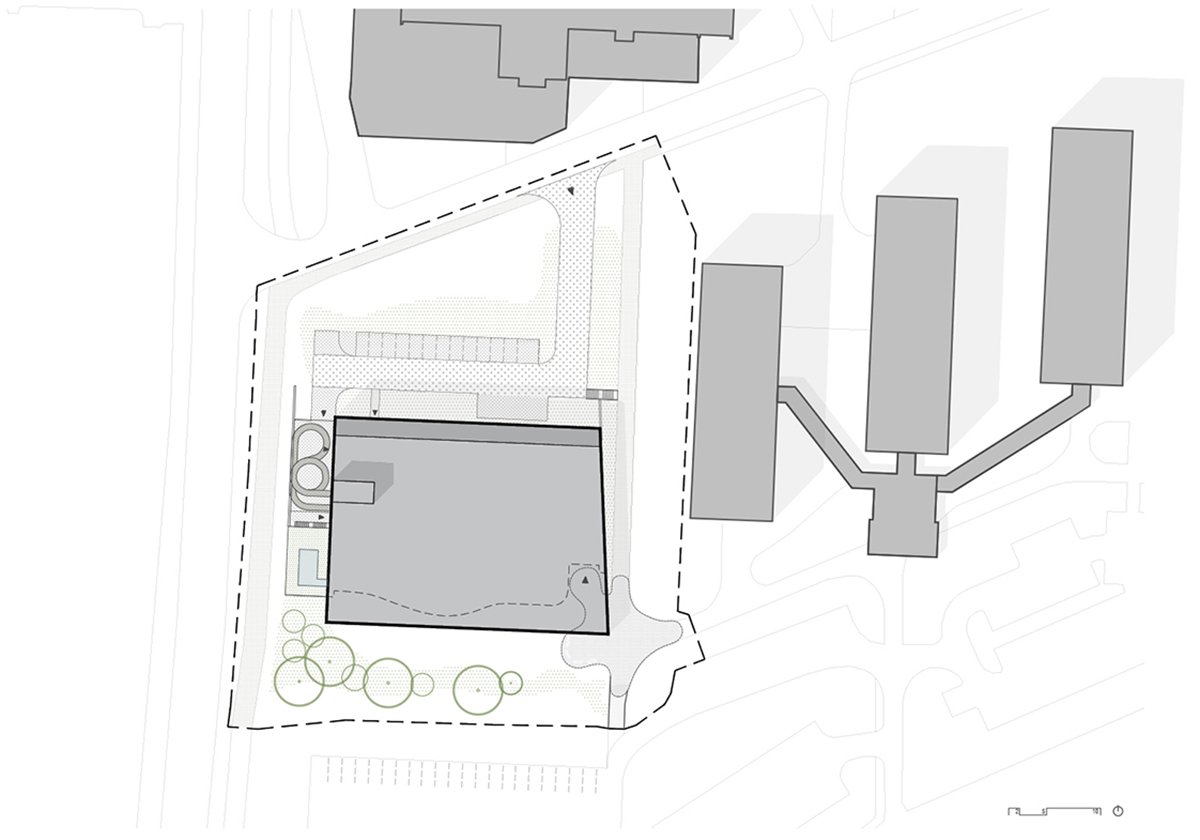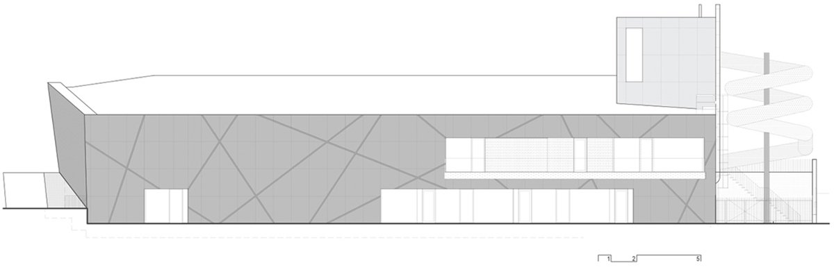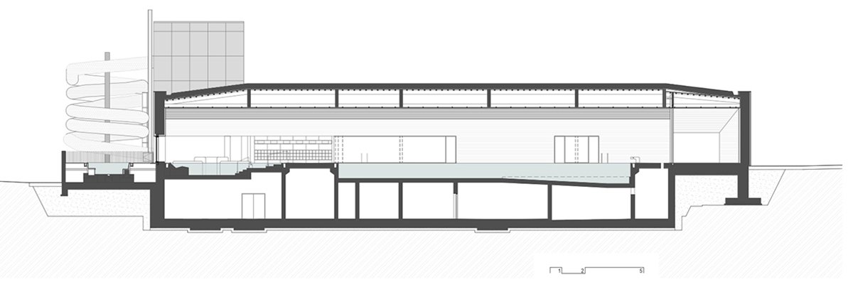 The tension of contrast between these two worlds is reflected in the rippling glass façade facing the public space that adjoins the neighbouring municipal office buildings. Through this mutual interaction revealing the secret of movement, residents are invited to spend their leisure time actively engaging in physical activities.