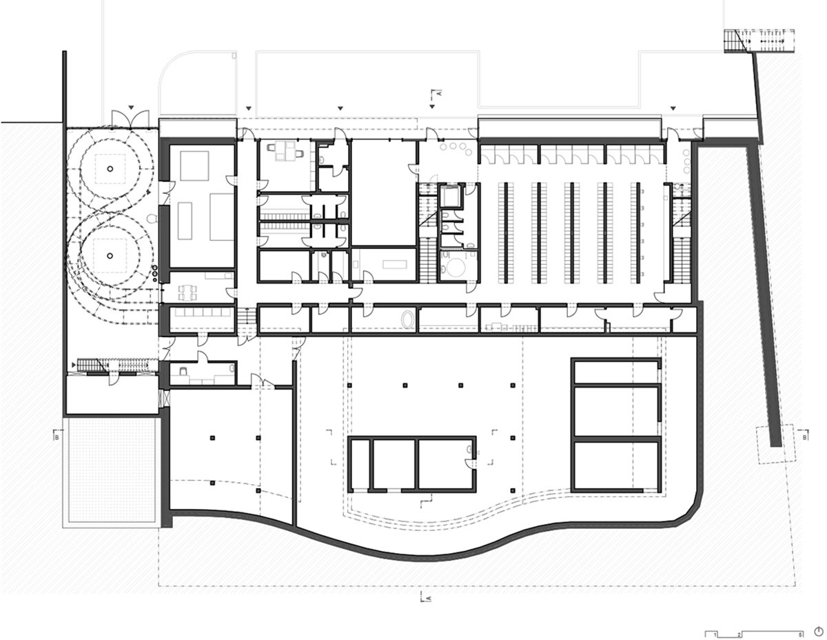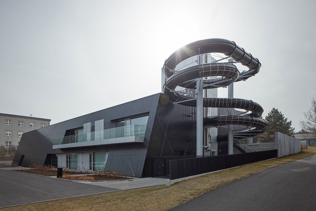 The basement containing technologies, facilities and storage space is attached to the original terrain level difference. The use of this local given minimizes necessary terrain works. The upper floor is dedicated solely to the water and sauna world with a communication centre point at the pool bar. On the west side of the building, there is an outdoor whirlpool and a water slide with a stairway tower, a symbol of swimming halls, positioned at the city’s main road.