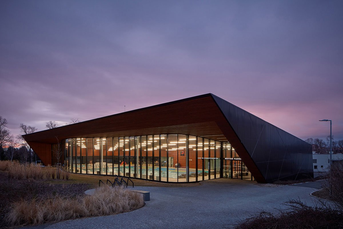 The building aims to exceed the usual way of swimming pool solutions, typical for its shunning of views from the surroundings. On the contrary, this swimming hall opens with the main glass façade. It gives passersby an insight into the sporting activities within. Placing the swimming pool scene in the city’s public space thus naturally encourages participation in sports and recreational activities inside the hall. The object’s openness enhances a positive perception of the swimming hall’s area as a space intended for anyone. This program breaks prejudices about the sporting environment, and locals are motivated to improve their fitness.