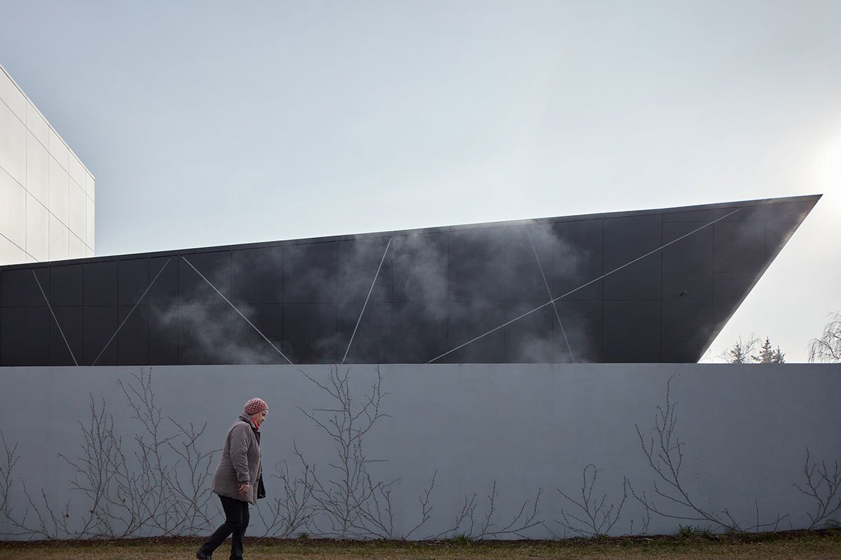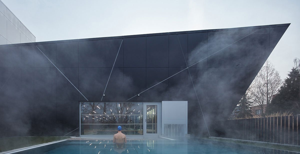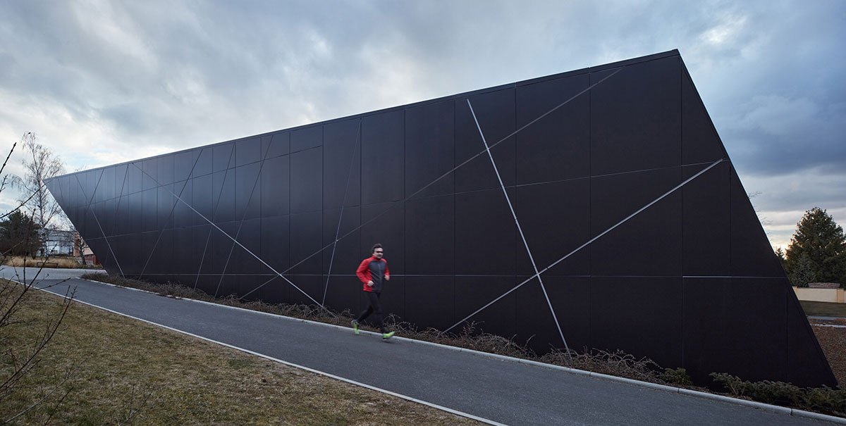 The significant roof slope corresponding with the local terrain slope provides the necessary clear height for the pool hall. At the same time, its overhang regulates sun rays penetration for different seasons. On the other hand, the standard clear height on the object’s north side fits a pool bar, showers and a sauna world. This world emerges from the crystal mass with its cooling terrace on the coldest side of the building with a view over the Bohemian Central Mountains.
