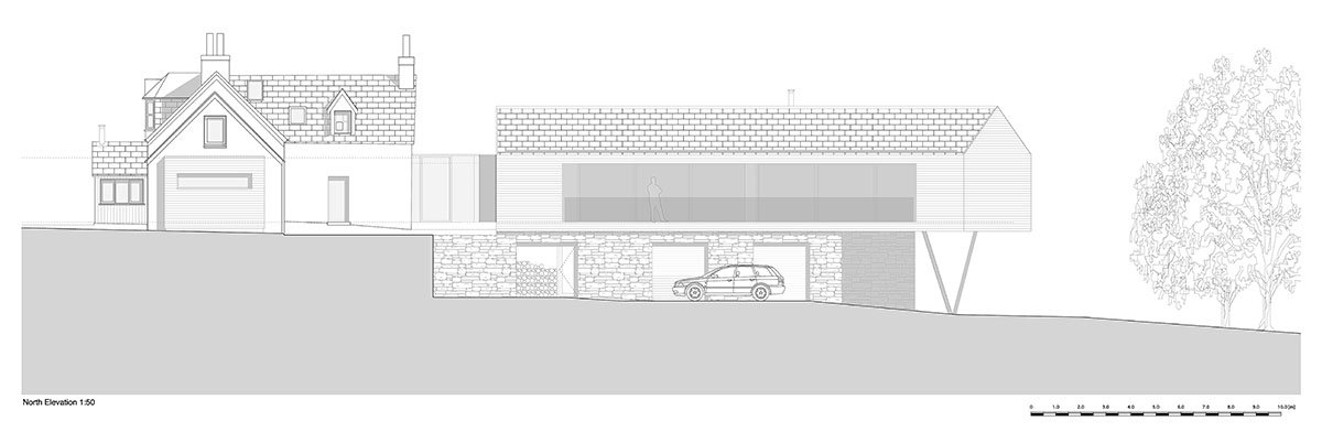 The client originally came to us with the brief of extending the existing house into the adjacent steading, which was 3m lower than the house, and 6m away, in addition to being on an irregular angle to the house. Our approach was to take down the steading, reusing the materials from it, before creating a replacement stone plinth, atop which could sit the main body of the extension, allowing for consistent floor levels between the historic and contemporary elements. An existing access track informed the limits of the extension, and was the driver for the building being larger at first floor, where it cantilevers over the track.