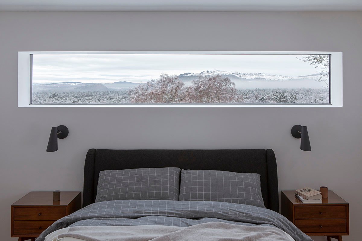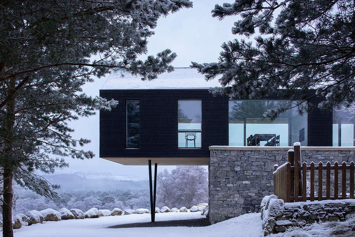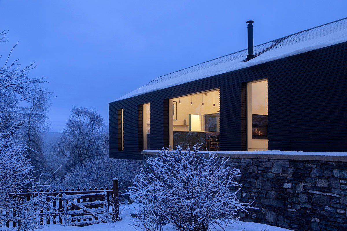 [Text as submitted by architect] Lower Tullochgrue is the refurbishment and extension of a traditional house in the heart of the Cairngorms National Park. A dilapidated steading has been replaced by a contemporary extension, with a timber and glass upper volume above a stone plinth, with the existing topography of the site maintained at all times. The brief was for the creation of a home which could be used by numerous members of a large family, both collectively and in smaller family groups. This drove the creation of large social spaces, separate guest accommodation in the form of a small separate block, and refurbishment of the original house to provide bedrooms for different members of the family across a large age range, with varying levels of mobility.