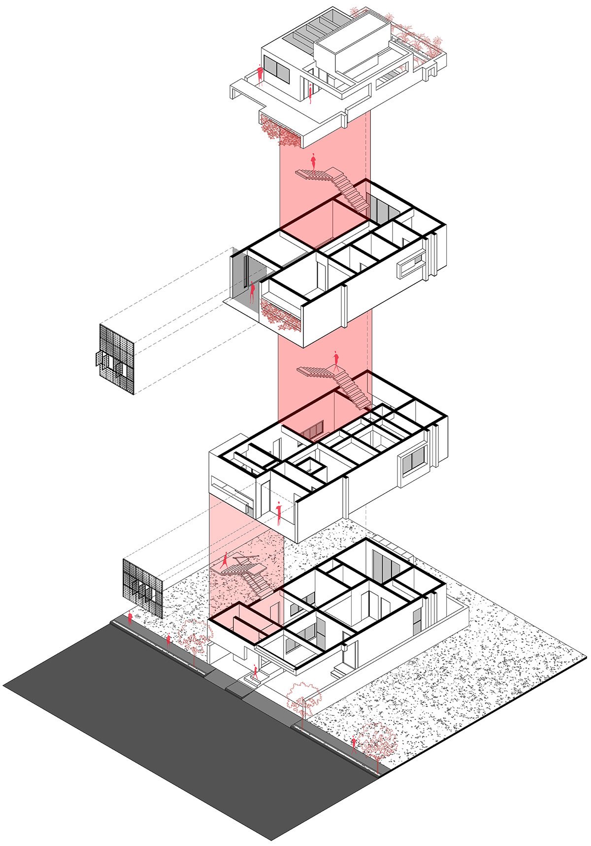 [Text as submitted by architect] The site is a typical 30’ x 50’ peri-urban parcel of land located towards the south of Bangalore, Electronic city. Trapped on three sides by plots which eventually will have neighbouring houses, only the front opens out to the road allowing for provision of light & ventilation to the house. The idea was to ensure maximum availability of light and ventilation without negotiating the privacy of its inhabitants.