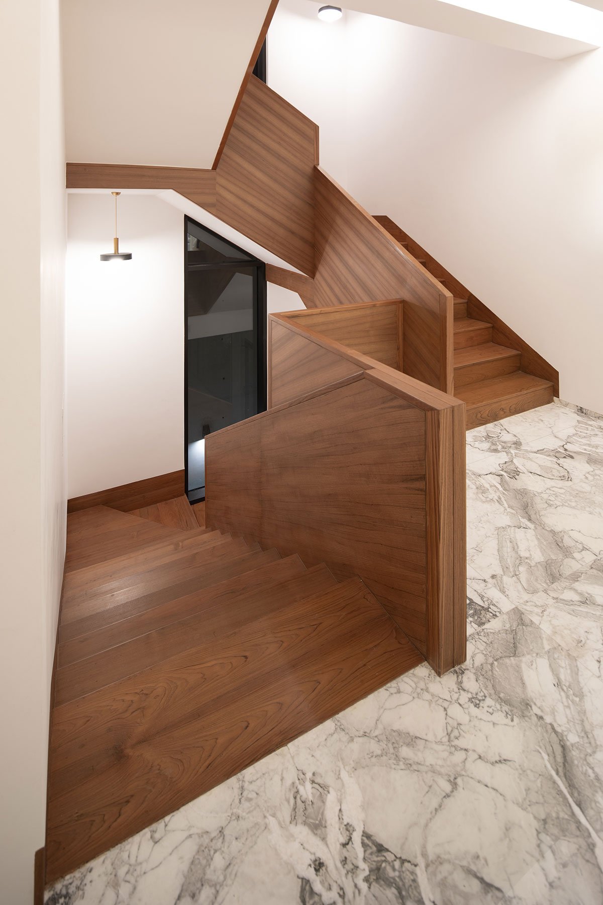 The sleeping quarters and family living are distributed on the first floor and also benefits from the introverted massing lit by the column of light. The house also features a 2 bedroom apartment with direct elevator access on the second floor, which opens out into a visually private roof garden.
