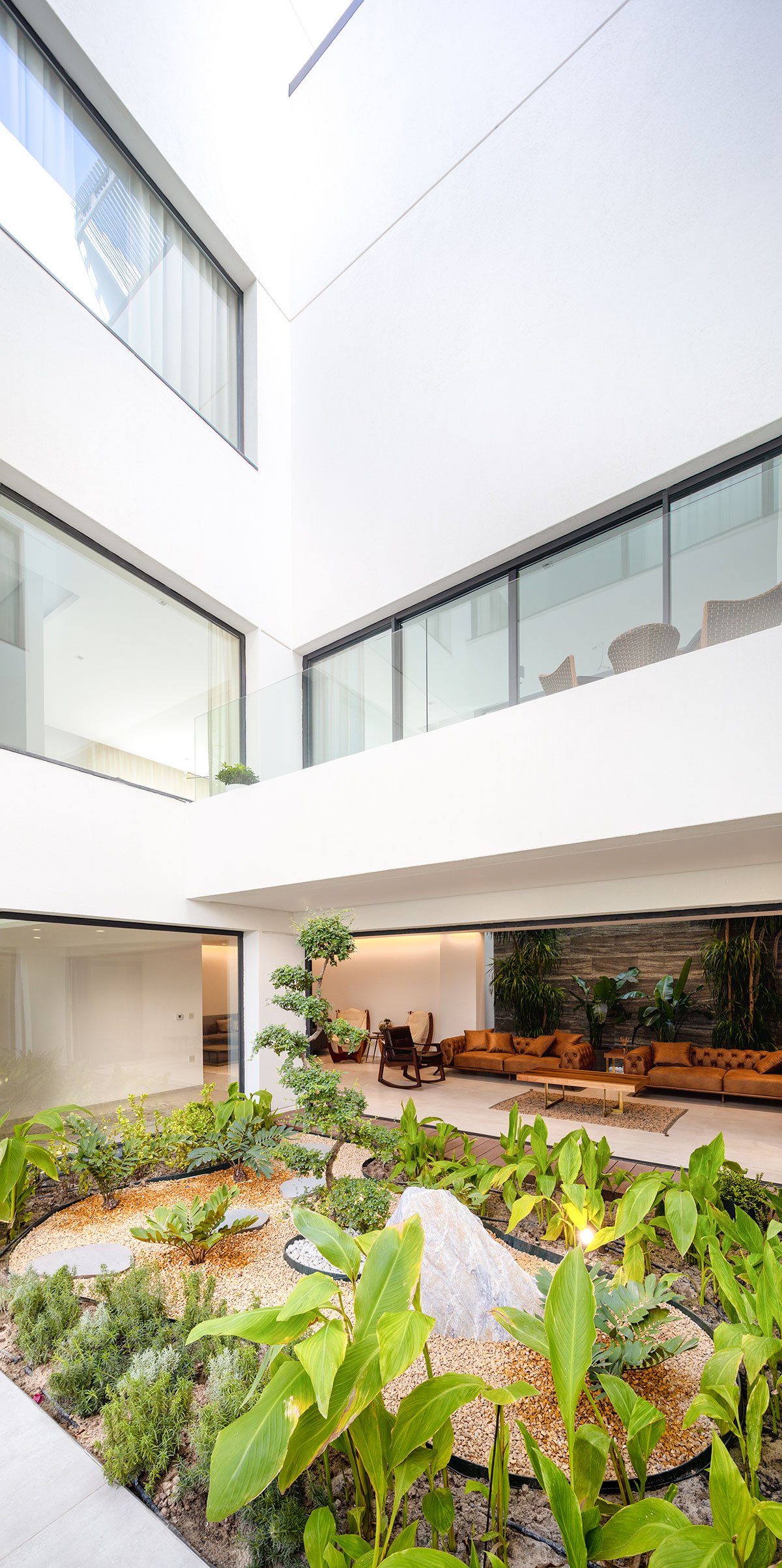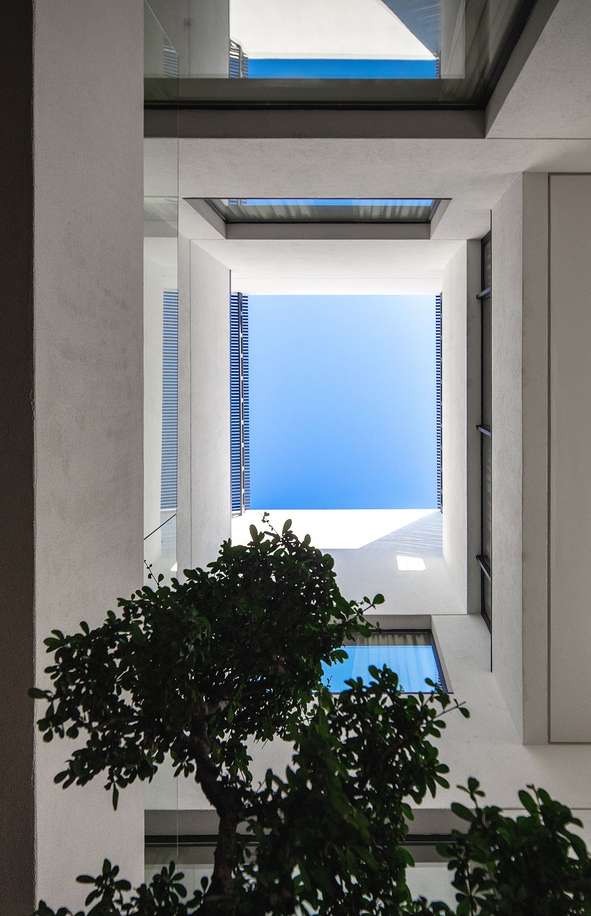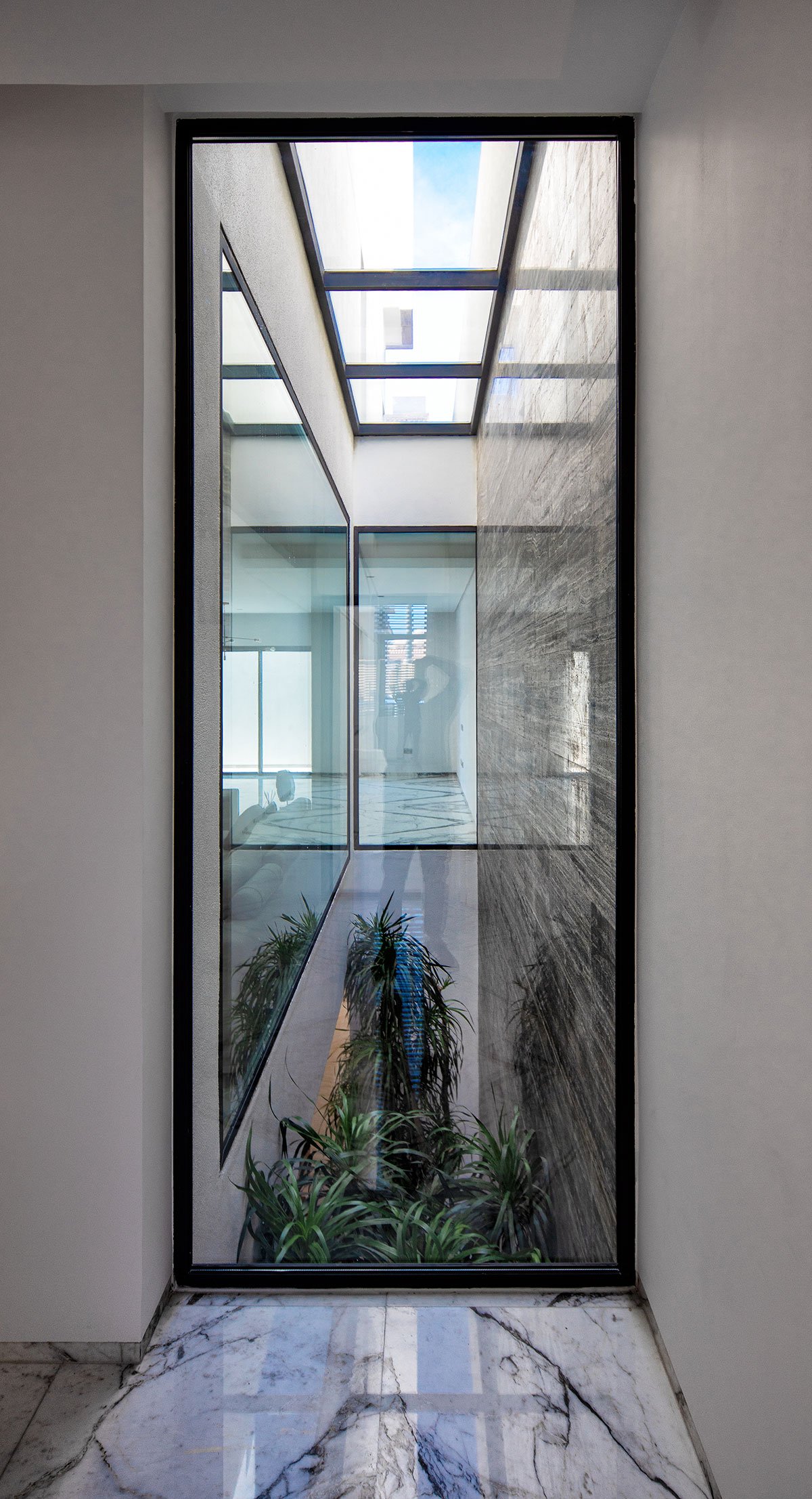 A very private but light-filled courtyard rises from the basement and cuts through the massing in the guise of a vertical void. All the internal spaces are grouped around this dynamic column of natural light, which lets in diffused and direct sunlight as required depending on the time of the day and season.