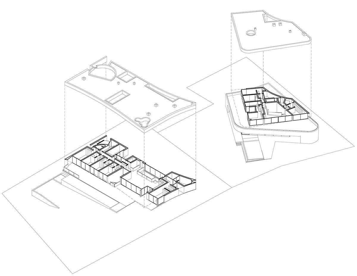The two new houses are supposed to be two individual parts of a set, two autonomous pieces that complement one another, two separate continents, where the contours clearly show the previous coexistence, or the union of two different people or an evocation of love through architecture. The slightly curved shapes suggest this connection, but the differences between them emphasize the individuality of each building.