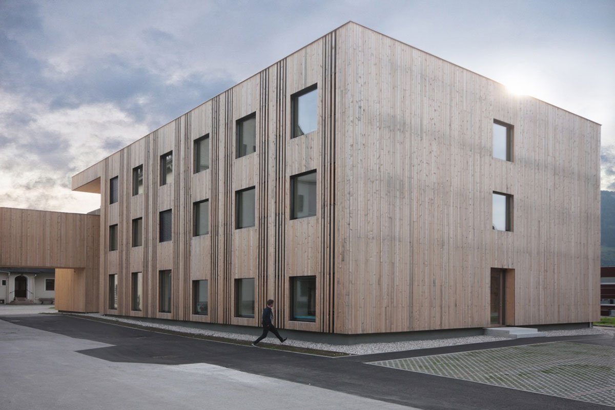 Excerpt: LWS Winklhof Oberalm by Lechner & Lechner Architects is a project that showcases an energetically optimized, sustainable timber construction. The building features vertical wooden formwork with battens for ventilation and a diffuse light effect. Student lounges connect the orangery and rooms, while above-ground components use constructive timber to highlight agricultural product wood and create a comfortable atmosphere.