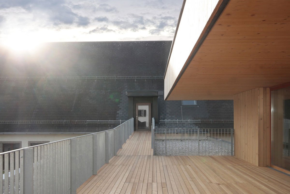 [Text as submitted by architect] The Winklhof is an agricultural school in Oberalm, near Salzburg. The existing atrium of the school complex was upgraded by the construction of the boarding wing. A conscious distance from the existing ensemble gives the new building an independence that reinforces the existing typology. Because of this, the extension is only connected to the existing building on the first floor via a bridge.