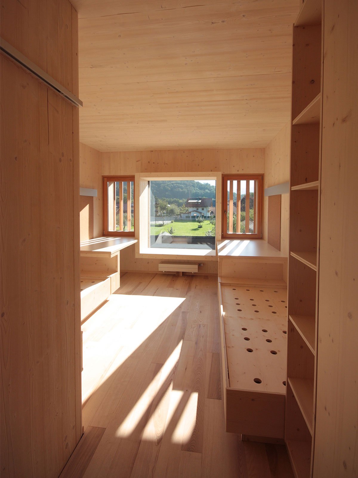 The existing flight of stairs in the school building remained untouched. A new staircase with a lift was created in the new building as a joint-forming element that sits between the connecting structure of the orangery and the student dormitory. The room layout is strictly two-sided, with a view of the Schlenken in the east and the Untersberg in the west. The wide window frames from a bay window that can be used to sit and lie down.